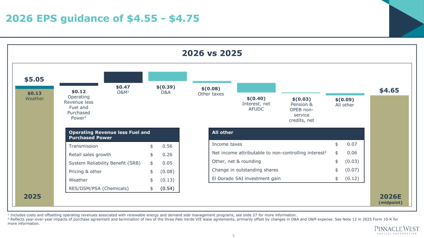 $0.64 ($0.12) ($0.12) ($0.05) ($0.14) ($0.22) ($0.21) $0.03 $5.24 $5.05 2025 vs 2024 Operating Revenue less Fuel and Purchased Power Sales/Usage $ 0.59 Transmission $ 0.31 2022 GRC impacts $ 0.29 Other $ 0.08 LFCR $ 0.06 RES/DSM $ 0.02 Weather $ (0.71) 2024 2025 1 Includes costs and offsetting operating revenues associated with renewable energy and demand side management programs, see slide 27 for more information. 2 All other includes change in weighted-average shares, other, net and rounding. 3 Reflects year-over-year impacts of purchase agreement and termination of two of the three Palo Verde VIE lease agreements, primarily offset by changes in D&A and O&M expense. See Note 12 in 2025 Form 10-K for more information. Operating Revenue less Fuel and Purchased Power1 O&M1 D&A Pension & OPEB non- service credits, net Interest, net AFUDC All other2 4 Full-Year results All Other El Dorado investment $ 0.18 Net income attributable to non-controlling interest3 $ 0.03 All other and rounding $ (0.03) 2024 BCE sale $ (0.14) Change in outstanding shares $ (0.25) Income Taxes Other taxes