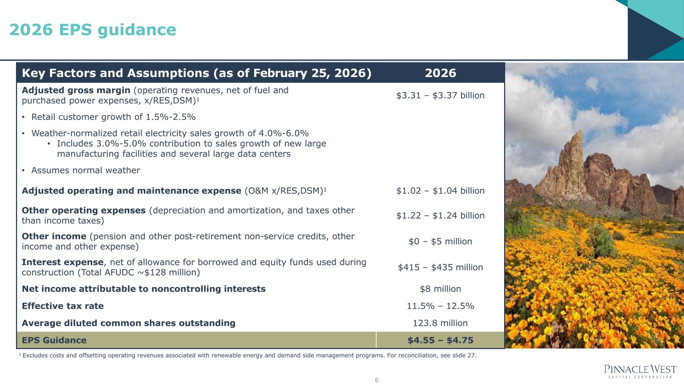 5 2026 EPS guidance of $4.55 - $4.75 $0.13 Weather 2026 vs 2025 Operating Revenue less Fuel and Purchased Power Transmission $ 0.56 Retail sales growth $ 0.26 System Reliability Benefit (SRB) $ 0.05 Pricing & other $ (0.08) Weather $ (0.13) RES/DSM/PSA (Chemicals) $ (0.54) All other Income taxes $ 0.07 Net income attributable to non-controlling interest2 $ 0.06 Other, net & rounding $ (0.03) Change in outstanding shares $ (0.07) El Dorado SAI investment gain $ (0.12) $0.12 Operating Revenue less Fuel and Purchased Power1 $0.47 O&M1 $(0.39) D&A $(0.08) Other taxes $(0.40) Interest, net AFUDC 2026E (midpoint) $4.65 $5.05 1 Includes costs and offsetting operating revenues associated with renewable energy and demand side management programs, see slide 27 for more information. 2 Reflects year-over-year impacts of purchase agreement and termination of two of the three Palo Verde VIE lease agreements, primarily offset by changes in D&A and O&M expense. See Note 12 in 2025 Form 10-K for more information. 2025 $(0.03) Pension & OPEB non- service credits, net $(0.09) All other