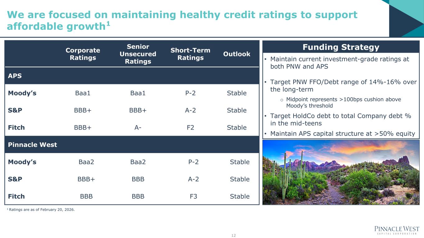 Approx. $3.8B Cash from Operations1 Total Capital Investment $2.6B-$2.9B APS Debt2 $300M-$350M PNW Debt2 1 Cash from operations is net of shareholder dividends. 2 APS and PNW debt issuance is net of maturities. 3 PNW equity is net of $485M already priced. 2026 Financing Plan 2026-2028 Financing Plan Approx. $8.0B $1.0B-$1.2B PNW Equity3 11 Optimized financing plan to support balanced capital structure 4 Includes maturities. 5 Excludes refinancing of existing term loan. 6 As of January 2026, amount represents $275M priced under PNW’s Block Equity Forward in February 2024 and $210M priced through the At-the-Market (ATM) program. DEBT Estimated Amount4 Maturities Completed APS $1.2B $250M $0 PNW5 $550M $350M $0 EQUITY Estimated Amount Priced6 Settled PNW $650M $485M $0 Funding Strategy • External equity to support balanced APS capital structure and expanded, accretive capital investment • Approximately 75% of the 2026 equity need has been priced • Maintain strong balance sheet and current credit ratings