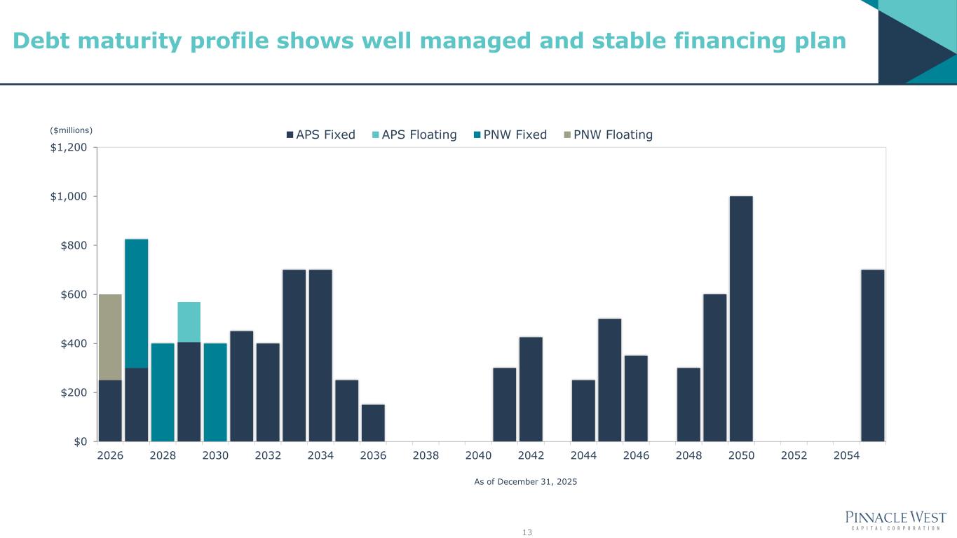 Corporate Ratings Senior Unsecured Ratings Short-Term Ratings Outlook APS Moody’s Baa1 Baa1 P-2 Stable S&P BBB+ BBB+ A-2 Stable Fitch BBB+ A- F2 Stable Pinnacle West Moody’s Baa2 Baa2 P-2 Stable S&P BBB+ BBB A-2 Stable Fitch BBB BBB F3 Stable 12 1 Ratings are as of February 20, 2026. We are focused on maintaining healthy credit ratings to support affordable growth1 Funding Strategy • Maintain current investment-grade ratings at both PNW and APS • Target PNW FFO/Debt range of 14%-16% over the long-term o Midpoint represents >100bps cushion above Moody’s threshold • Target HoldCo debt to total Company debt % in the mid-teens • Maintain APS capital structure at >50% equity