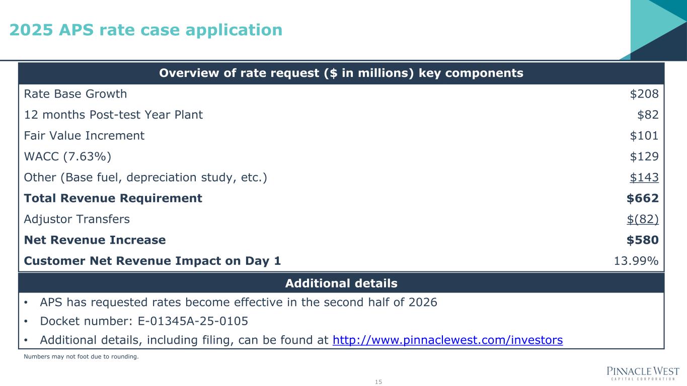 15 2025 APS rate case application Overview of rate request ($ in millions) key components Rate Base Growth $208 12 months Post-test Year Plant $82 Fair Value Increment $101 WACC (7.63%) $129 Other (Base fuel, depreciation study, etc.) $143 Total Revenue Requirement $662 Adjustor Transfers $(82) Net Revenue Increase $580 Customer Net Revenue Impact on Day 1 13.99% Additional details • APS has requested rates become effective in the second half of 2026 • Docket number: E-01345A-25-0105 • Additional details, including filing, can be found at http://www.pinnaclewest.com/investors Numbers may not foot due to rounding.