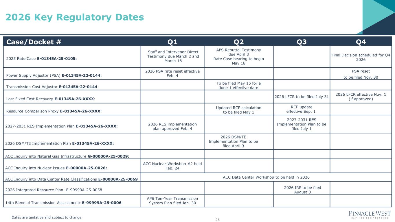 Case/Docket # Q1 Q2 Q3 Q4 2025 Rate Case E-01345A-25-0105: Staff and Intervenor Direct Testimony due March 2 and March 18 APS Rebuttal Testimony due April 3 Rate Case hearing to begin May 18 Final Decision scheduled for Q4 2026 Power Supply Adjustor (PSA) E-01345A-22-0144: 2026 PSA rate reset effective Feb. 4 PSA reset to be filed Nov. 30 Transmission Cost Adjustor E-01345A-22-0144: To be filed May 15 for a June 1 effective date Lost Fixed Cost Recovery E-01345A-26-XXXX: 2026 LFCR to be filed July 31 2026 LFCR effective Nov. 1 (if approved) Resource Comparison Proxy E-01345A-26-XXXX: Updated RCP calculation to be filed May 1 RCP update effective Sep. 1 2027-2031 RES Implementation Plan E-01345A-26-XXXX: 2026 RES implementation plan approved Feb. 4 2027-2031 RES Implementation Plan to be filed July 1 2026 DSM/TE Implementation Plan E-01345A-26-XXXX: 2026 DSM/TE Implementation Plan to be filed April 9 ACC Inquiry into Natural Gas Infrastructure G-00000A-25-0029: ACC Inquiry into Nuclear Issues E-00000A-25-0026: ACC Nuclear Workshop #2 held Feb. 24 ACC Inquiry into Data Center Rate Classifications E-00000A-25-0069 ACC Data Center Workshop to be held in 2026 2026 Integrated Resource Plan: E-99999A-25-0058 2026 IRP to be filed August 3 14th Biennial Transmission Assessment: E-99999A-25-0006 APS Ten-Year Transmission System Plan filed Jan. 30 28 2026 Key Regulatory Dates Dates are tentative and subject to change.