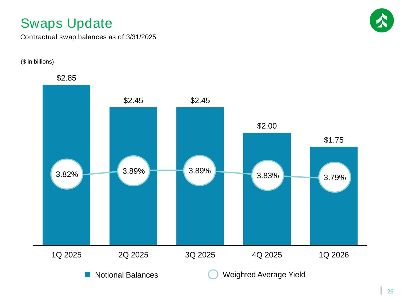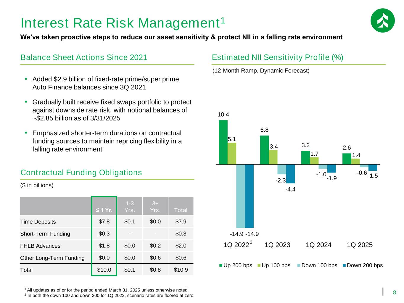 5 $1.7 $1.6 $1.6 $1.7 $1.8 $4.3 $3.9 $4.2 $4.5 $4.3 $2.9 $3.0 $3.3 $3.7 $3.8 $6.1 $6.0 $5.9 $5.9 $6.1 $4.9 $5.1 $5.1 $5.1 $5.2 $7.5 $7.3 $7.4 $7.6 $8.0 $5.9 $5.7 $5.7 $5.7 $5.6 $33.3 $32.6 $33.3 $34.3 $34.8 1Q 2024 2Q 2024 3Q 2024 4Q 2024 1Q 2025 Average Quarterly Deposits ($ in billions) Period End Funding Change (12/31/2024 to 3/31/2025) ($ in millions) Customer CDs Savings Money Market Network Transaction Deposits Noninterest-Bearing Demand Interest-Bearing Demand Brokered CDs 1 This is a non-GAAP financial measure. See appendix for a reconciliation of non-GAAP financial measures to GAAP financial measures. $(124) $20 $114 $131 $360 Interest-Bearing Demand Money Market Core Customer Deposits1 +$503 (+2%) Wholesale Funding Sources $(186) (-2%) Total Deposits +$548 (+2%) Noninterest-Bearing Demand Quarterly Deposit & Funding Trends Savings Total period end deposits & core customer deposits1 both increased 2% vs. the prior quarter Customer CDs $(405) $(79) $125 $173 FHLB Advances Other Wholesale Funding Network Transaction Deposits Brokered CDs