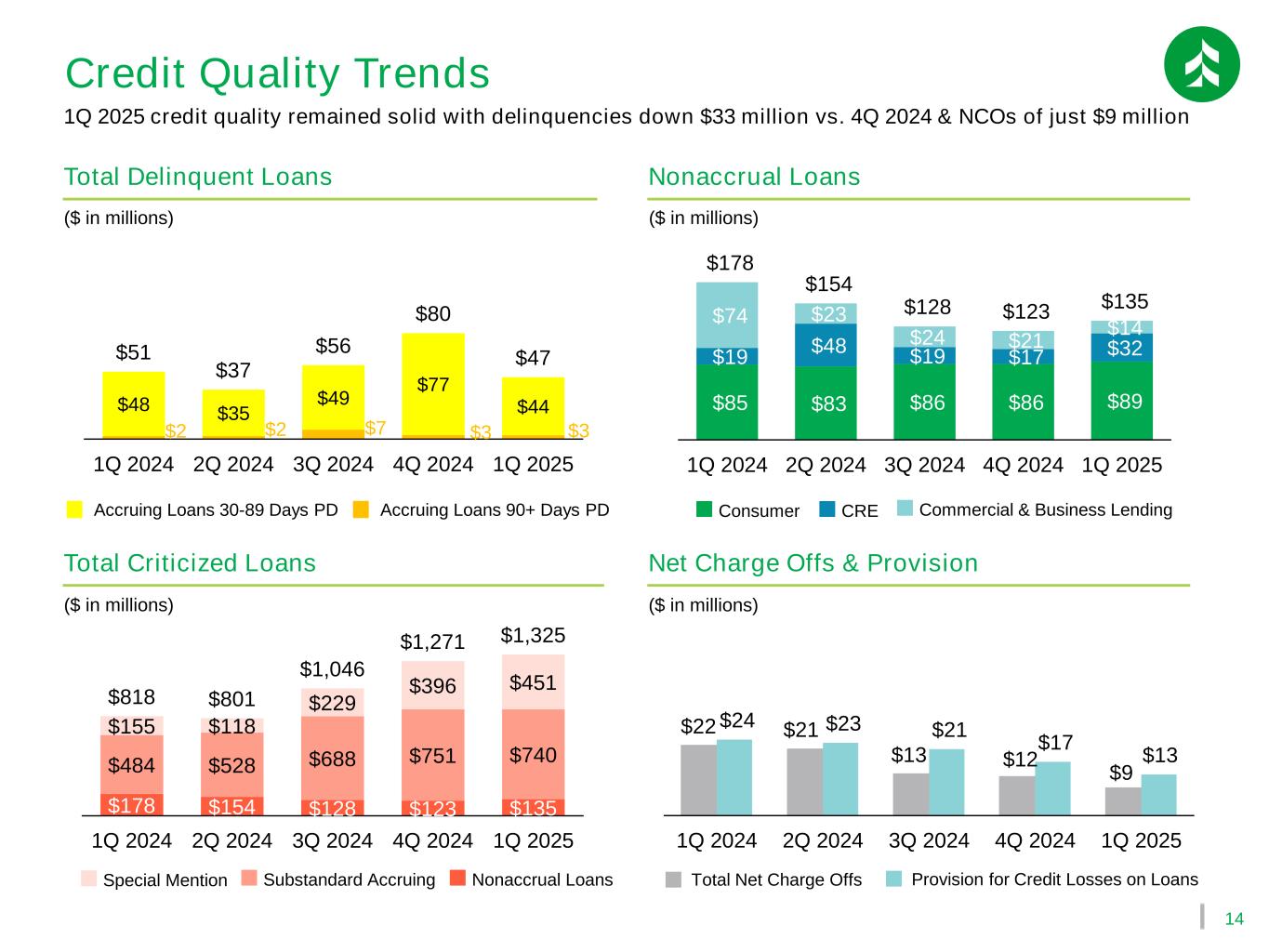 13 ACLL / Total Loans (%)ACLL1 Update ▪ ACLL increased $4 million from the prior quarter to $407 million, driven primarily by incremental credit movement coupled with general macroeconomic trends ▪ CECL forward-looking assumptions based on Moody’s February 2025 Baseline forecast 1 Includes funded and unfunded reserve for loans, excludes reserve for HTM securities. ($ in thousands) Allowance for Credit Losses on Loans (ACLL) 1.31 1.32 1.33 1.35 1.34 1Q 2024 2Q 2024 3Q 2024 4Q 2024 1Q 2025 Our ACLL percentage decreased by 1 basis point vs. the prior quarter to 1.34% Loan Category ACLL ACLL / Loans ACLL ACLL / Loans ACLL ACLL / Loans C&BL 157,933$ 1.44% 160,620$ 1.37% 172,257$ 1.43% CRE - Investor 72,512 1.44% 72,125 1.38% 79,149 1.41% CRE - Construction 64,225 2.81% 71,090 3.59% 59,873 3.31% Residential Mortgage 35,915 0.46% 32,576 0.46% 34,160 0.49% Other Consumer 57,198 1.71% 65,910 1.74% 61,184 1.59% Total 387,782$ 1.31% 402,322$ 1.35% 406,624$ 1.34% 3/31/202512/31/20243/31/2024