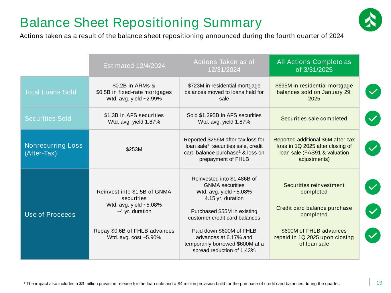 191 The impact also includes a $3 million provision release for the loan sale and a $4 million provision build for the purchase of credit card balances during the quarter. Balance Sheet Repositioning Summary Estimated 12/4/2024 Actions Taken as of 12/31/2024 All Actions Complete as of 3/31/2025 Total Loans Sold $0.2B in ARMs & $0.5B in fixed-rate mortgages Wtd. avg. yield ~2.99% $723M in residential mortgage balances moved to loans held for sale $695M in residential mortgage balances sold on January 29, 2025 Securities Sold $1.3B in AFS securities Wtd. avg. yield 1.87% Sold $1.295B in AFS securities Wtd. avg. yield 1.87% Securities sale completed Nonrecurring Loss (After-Tax) $253M Reported $256M after-tax loss for loan sale1, securities sale, credit card balance purchase1 & loss on prepayment of FHLB Reported additional $6M after-tax loss in 1Q 2025 after closing of loan sale (FAS91 & valuation adjustments) Use of Proceeds Reinvest into $1.5B of GNMA securities Wtd. avg. yield ~5.08% ~4 yr. duration Repay $0.6B of FHLB advances Wtd. avg. cost ~5.90% Reinvested into $1.486B of GNMA securities Wtd. avg. yield ~5.08% 4.15 yr. duration Purchased $55M in existing customer credit card balances Paid down $600M of FHLB advances at 6.17% and temporarily borrowed $600M at a spread reduction of 1.43% Securities reinvestment completed Credit card balance purchase completed $600M of FHLB advances repaid in 1Q 2025 upon closing of loan sale Actions taken as a result of the balance sheet repositioning announced during the fourth quarter of 2024