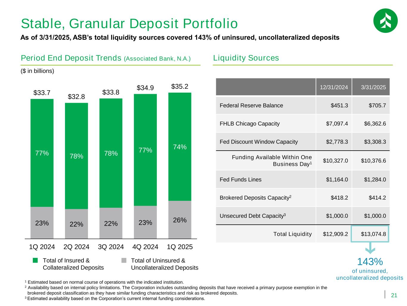 23 $1.8 $1.5 $1.6 $1.8 $1.9 $3.9 $4.1 $4.2 $4.3 $4.2 $2.9 $3.1 $3.7 $3.7 $3.7 $6.2 $5.9 $5.8 $6.0 $6.1 $5.1 $5.2 $5.1 $5.1 $5.2 $7.5 $7.2 $7.3 $8.0 $7.9 $6.3 $5.8 $5.9 $5.8 $6.1 $33.7 $32.7 $33.6 $34.6 $35.2 1Q 2024 2Q 2024 3Q 2024 4Q 2024 1Q 2025 Period End Quarterly Deposits ($ in billions) Average Funding Change (4Q 2024 to 1Q 2025) ($ in millions) Customer CDs Savings Money Market Network Transaction Deposits Noninterest-Bearing Demand Interest-Bearing Demand Brokered CDs $(98) $30 $43 $155 $408 Noninterest-Bearing Demand Money Market $(205) $(200) $140 $157 Network Transaction Deposits Other Wholesale Funding Core Customer Deposits1 +$538 (+2%) Wholesale Funding Sources $(107) (-1%) Total Deposits +$496 (+1%) Interest-Bearing Demand FHLB Advances Additional Quarterly Deposit & Funding Trends Customer CDs Savings Brokered CDs 1 This is a non-GAAP financial measure. See appendix for a reconciliation of non-GAAP financial measures to GAAP financial measures.
