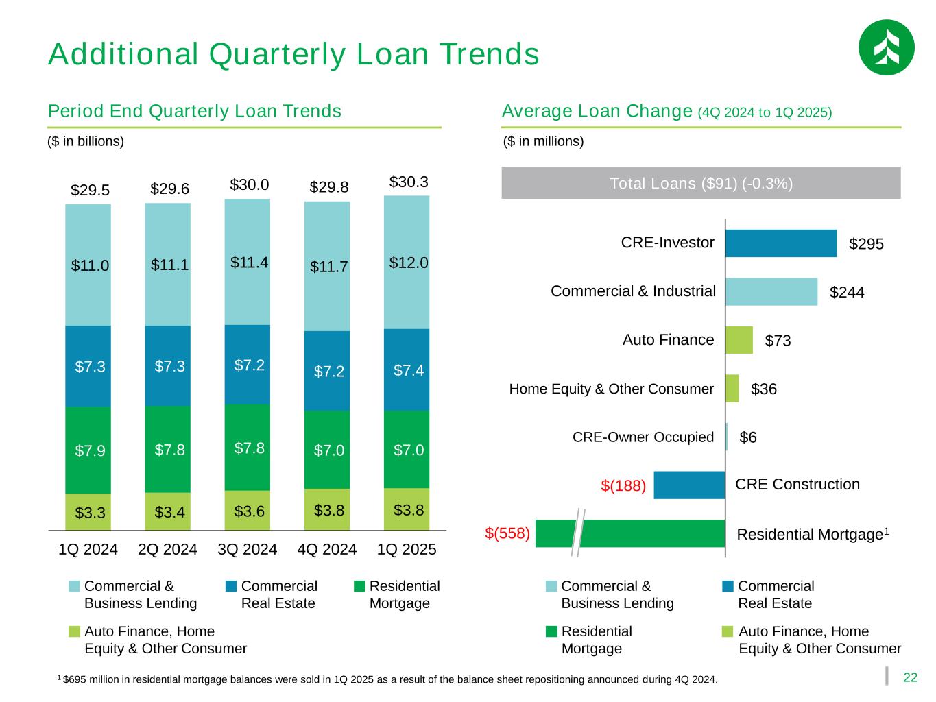 22 $3.3 $3.4 $3.6 $3.8 $3.8 $7.9 $7.8 $7.8 $7.0 $7.0 $7.3 $7.3 $7.2 $7.2 $7.4 $11.0 $11.1 $11.4 $11.7 $12.0 $29.5 $29.6 $30.0 $29.8 $30.3 1Q 2024 2Q 2024 3Q 2024 4Q 2024 1Q 2025 ($ in billions) Commercial & Business Lending Commercial Real Estate Residential Mortgage Auto Finance, Home Equity & Other Consumer ($ in millions) Average Loan Change (4Q 2024 to 1Q 2025)Period End Quarterly Loan Trends $(188) $6 $36 $73 $244 $295 CRE-Investor CRE Construction Auto Finance Commercial & Industrial Residential Mortgage1 Additional Quarterly Loan Trends Commercial & Business Lending Commercial Real Estate Residential Mortgage Auto Finance, Home Equity & Other Consumer $(558) CRE-Owner Occupied Home Equity & Other Consumer 1 $695 million in residential mortgage balances were sold in 1Q 2025 as a result of the balance sheet repositioning announced during 4Q 2024. Total Loans ($91) (-0.3%)