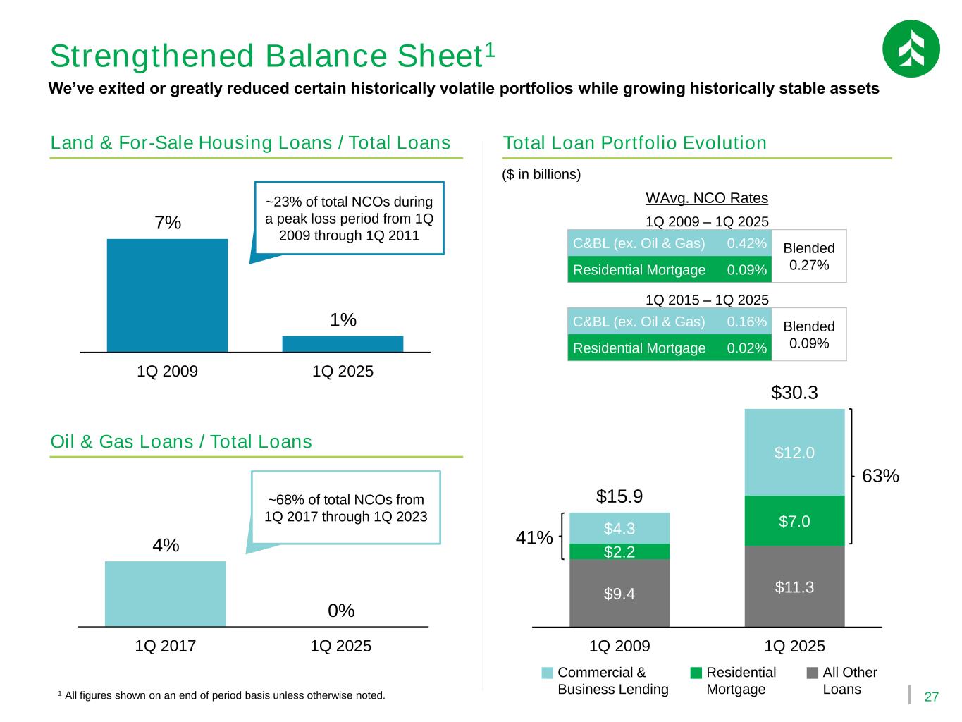 27 4% 0% 1Q 2017 1Q 2025 7% 1% 1Q 2009 1Q 2025 Strengthened Balance Sheet1 $9.4 $11.3 $2.2 $7.0$4.3 $12.0 $15.9 $30.3 1Q 2009 1Q 2025 Land & For-Sale Housing Loans / Total Loans Oil & Gas Loans / Total Loans Total Loan Portfolio Evolution ($ in billions) Commercial & Business Lending Residential Mortgage All Other Loans1 All figures shown on an end of period basis unless otherwise noted. 41% 63% 1Q 2015 – 1Q 2025 C&BL (ex. Oil & Gas) 0.16% Blended 0.09%Residential Mortgage 0.02% ~23% of total NCOs during a peak loss period from 1Q 2009 through 1Q 2011 ~68% of total NCOs from 1Q 2017 through 1Q 2023 1Q 2009 – 1Q 2025 C&BL (ex. Oil & Gas) 0.42% Blended 0.27%Residential Mortgage 0.09% WAvg. NCO Rates We’ve exited or greatly reduced certain historically volatile portfolios while growing historically stable assets