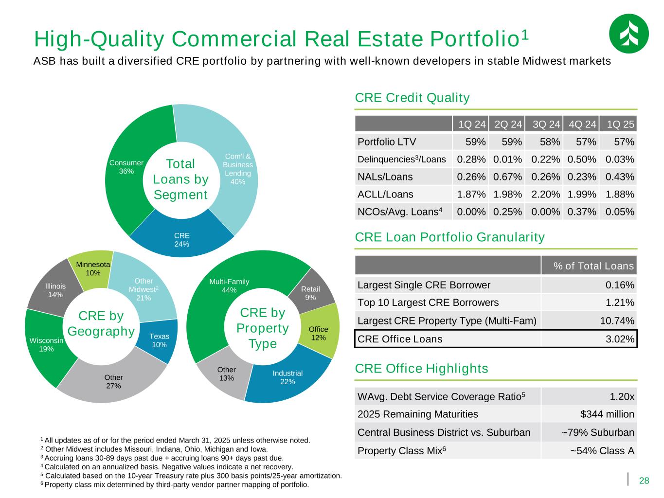 28 Multi-Family 44% Retail 9% Office 12% Industrial 22% Other 13% Consumer 36% Com'l & Business Lending 40% CRE 24% Wisconsin 19% Illinois 14% Minnesota 10% Other Midwest2 21% Texas 10% Other 27% 1 All updates as of or for the period ended March 31, 2025 unless otherwise noted. 2 Other Midwest includes Missouri, Indiana, Ohio, Michigan and Iowa. 3 Accruing loans 30-89 days past due + accruing loans 90+ days past due. 4 Calculated on an annualized basis. Negative values indicate a net recovery. 5 Calculated based on the 10-year Treasury rate plus 300 basis points/25-year amortization. 6 Property class mix determined by third-party vendor partner mapping of portfolio. High-Quality Commercial Real Estate Portfolio1 1Q 24 2Q 24 3Q 24 4Q 24 1Q 25 Portfolio LTV 59% 59% 58% 57% 57% Delinquencies3/Loans 0.28% 0.01% 0.22% 0.50% 0.03% NALs/Loans 0.26% 0.67% 0.26% 0.23% 0.43% ACLL/Loans 1.87% 1.98% 2.20% 1.99% 1.88% NCOs/Avg. Loans4 0.00% 0.25% 0.00% 0.37% 0.05% CRE Credit Quality CRE Loan Portfolio Granularity % of Total Loans Largest Single CRE Borrower 0.16% Top 10 Largest CRE Borrowers 1.21% Largest CRE Property Type (Multi-Fam) 10.74% CRE Office Loans 3.02% CRE by Geography CRE by Property Type Total Loans by Segment CRE Office Highlights WAvg. Debt Service Coverage Ratio5 1.20x 2025 Remaining Maturities $344 million Central Business District vs. Suburban ~79% Suburban Property Class Mix6 ~54% Class A ASB has built a diversified CRE portfolio by partnering with well-known developers in stable Midwest markets