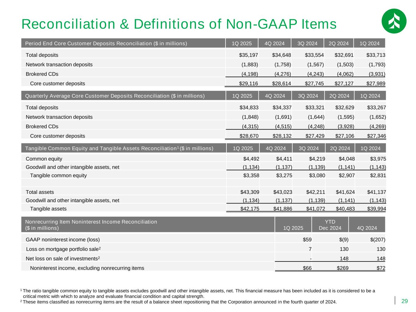 29 Period End Core Customer Deposits Reconciliation ($ in millions) 1Q 2025 4Q 2024 3Q 2024 2Q 2024 1Q 2024 Total deposits $35,197 $34,648 $33,554 $32,691 $33,713 Network transaction deposits (1,883) (1,758) (1,567) (1,503) (1,793) Brokered CDs (4,198) (4,276) (4,243) (4,062) (3,931) Core customer deposits $29,116 $28,614 $27,745 $27,127 $27,989 Reconciliation & Definitions of Non-GAAP Items 1 The ratio tangible common equity to tangible assets excludes goodwill and other intangible assets, net. This financial measure has been included as it is considered to be a critical metric with which to analyze and evaluate financial condition and capital strength. 2 These items classified as nonrecurring items are the result of a balance sheet repositioning that the Corporation announced in the fourth quarter of 2024. Quarterly Average Core Customer Deposits Reconciliation ($ in millions) 1Q 2025 4Q 2024 3Q 2024 2Q 2024 1Q 2024 Total deposits $34,833 $34,337 $33,321 $32,629 $33,267 Network transaction deposits (1,848) (1,691) (1,644) (1,595) (1,652) Brokered CDs (4,315) (4,515) (4,248) (3,928) (4,269) Core customer deposits $28,670 $28,132 $27,429 $27,106 $27,346 Tangible Common Equity and Tangible Assets Reconciliation1 ($ in millions) 1Q 2025 4Q 2024 3Q 2024 2Q 2024 1Q 2024 Common equity $4,492 $4,411 $4,219 $4,048 $3,975 Goodwill and other intangible assets, net (1,134) (1,137) (1,139) (1,141) (1,143) Tangible common equity $3,358 $3,275 $3,080 $2,907 $2,831 Total assets $43,309 $43,023 $42,211 $41,624 $41,137 Goodwill and other intangible assets, net (1,134) (1,137) (1,139) (1,141) (1,143) Tangible assets $42,175 $41,886 $41,072 $40,483 $39,994 Nonrecurring Item Noninterest Income Reconciliation ($ in millions) 1Q 2025 YTD Dec 2024 4Q 2024 GAAP noninterest income (loss) $59 $(9) $(207) Loss on mortgage portfolio sale2 7 130 130 Net loss on sale of investments2 - 148 148 Noninterest income, excluding nonrecurring items $66 $269 $72