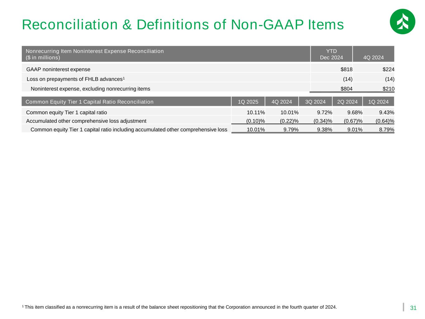 30 Reconciliation & Definitions of Non-GAAP Items 1 Announced initiatives include the loss on mortgage portfolio sale and loss on prepayment of FHLB advances as a result of the balance sheet repositioning that the Corporation announced in the fourth quarter of 2024. The net loss on the sale of investments is already excluded from noninterest income within the efficiency ratio. Non-GAAP Efficiency Ratios Reconciliation ($ in millions) 1Q 2025 4Q 2024 3Q 2024 2Q 2024 1Q 2024 Total expense for efficiency ratios reconciliation Noninterest expense $211 $224 $201 $196 $198 Less: Other intangible amortization 2 2 2 2 2 Total expense for fully tax-equivalent efficiency ratio 208 222 198 194 195 Less: FDIC special assessment - - - - 8 Less: Announced initiatives1 - 14 - - - Total expense for adjusted efficiency ratio 208 208 198 194 188 Total revenue for efficiency ratios reconciliation Net interest income 286 270 263 257 258 Noninterest income 59 (207) 67 65 65 Less: Investment securities gains (losses), net - (148) - - 4 Fully tax-equivalent adjustment 4 4 4 4 4 Total revenue for fully tax-equivalent efficiency ratio 349 215 333 325 323 Less: Announced initiatives1 (7) (130) - - - Total revenue for adjusted efficiency ratio 356 346 333 325 323 Efficiency Ratios (expense / revenue) Fully tax-equivalent efficiency ratio 59.72% 103.11% 59.51% 59.51% 60.56% Adjusted efficiency ratio 58.55% 60.10% 59.51% 59.51% 58.18%