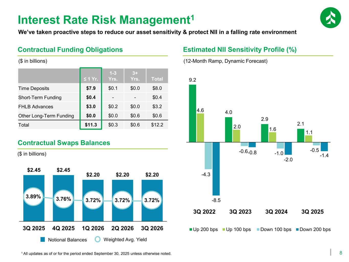 7 Net Interest Income & Net Interest Margin Trends $263 $270 $286 $300 $305 3Q 2024 4Q 2024 1Q 2025 2Q 2025 3Q 2025 2.97% 2.81% 2.78% 3.04% 3.04% ($ in millions) Quarterly Net Interest Income Quarterly Net Interest Margin Net interest income increased by $5 million vs. the prior quarter to $305 million