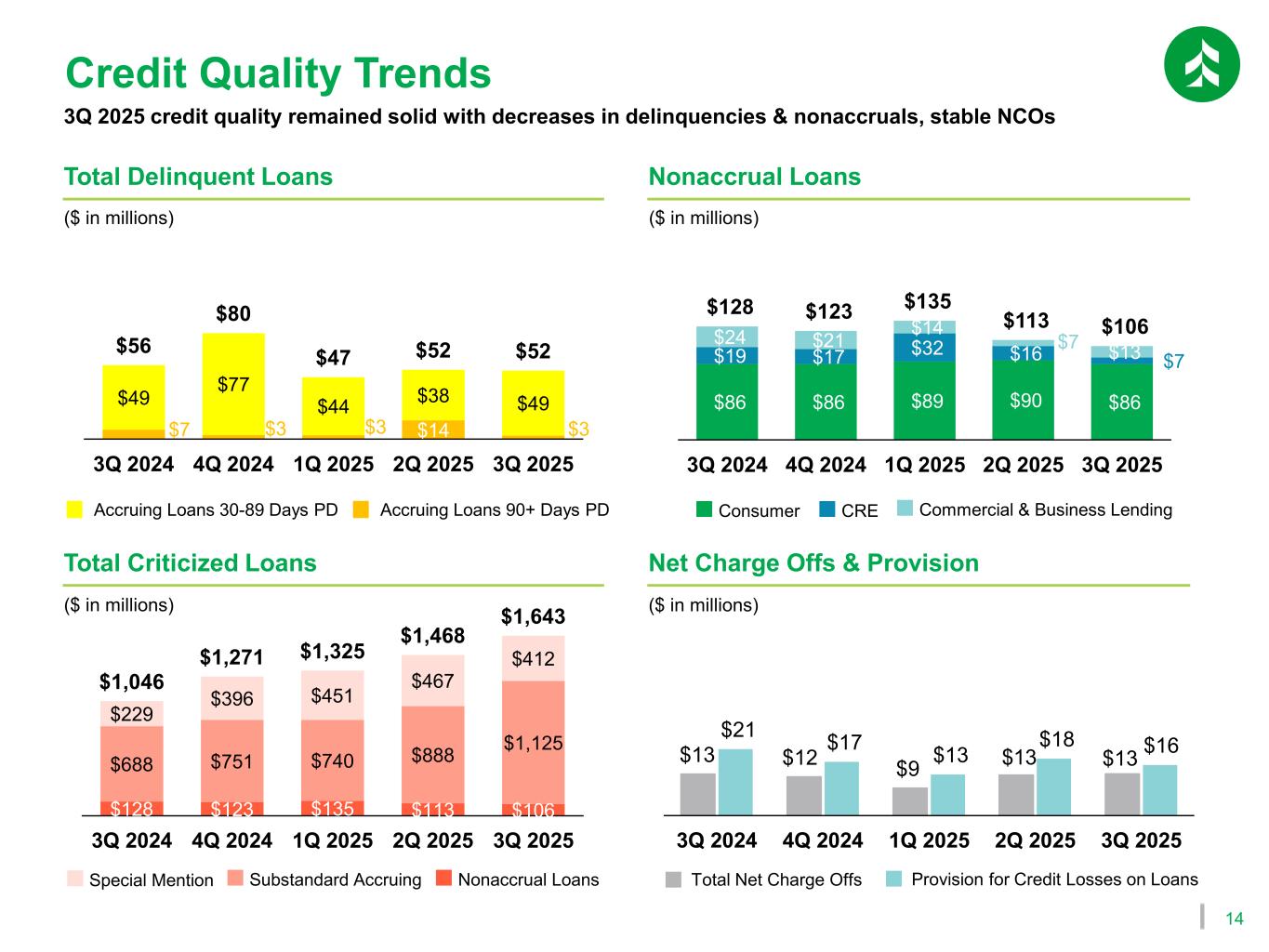 13 ACLL / Total LoansACLL1 Update ▪ ACLL increased $3 million from the prior quarter to $415 million, driven primarily by loan growth plus some incremental credit movement and general macroeconomic trends ▪ CECL forward-looking assumptions based on Moody’s August 2025 Baseline forecast 1 Includes funded and unfunded reserve for loans, excludes reserve for HTM securities. ($ in thousands) Allowance for Credit Losses on Loans (ACLL) 1.33 1.35 1.34 1.35 1.34 3Q 2024 4Q 2024 1Q 2025 2Q 2025 3Q 2025 Our ACLL percentage decreased by 1 basis point vs. the prior quarter to 1.34% (%) Loan Category ACLL ACLL / Loans ACLL ACLL / Loans ACLL ACLL / Loans C&BL 143,974$ 1.27% 186,135$ 1.50% 189,277$ 1.49% CRE - Investor 78,743 1.55% 63,342 1.18% 62,454 1.16% CRE - Construction 79,136 3.74% 65,885 3.38% 65,324 3.33% Residential Mortgage 34,931 0.45% 34,096 0.49% 34,815 0.51% Other Consumer 60,756 1.68% 62,332 1.58% 62,748 1.55% Total 397,541$ 1.33% 411,791$ 1.35% 414,618$ 1.34% 9/30/2024 6/30/2025 9/30/2025