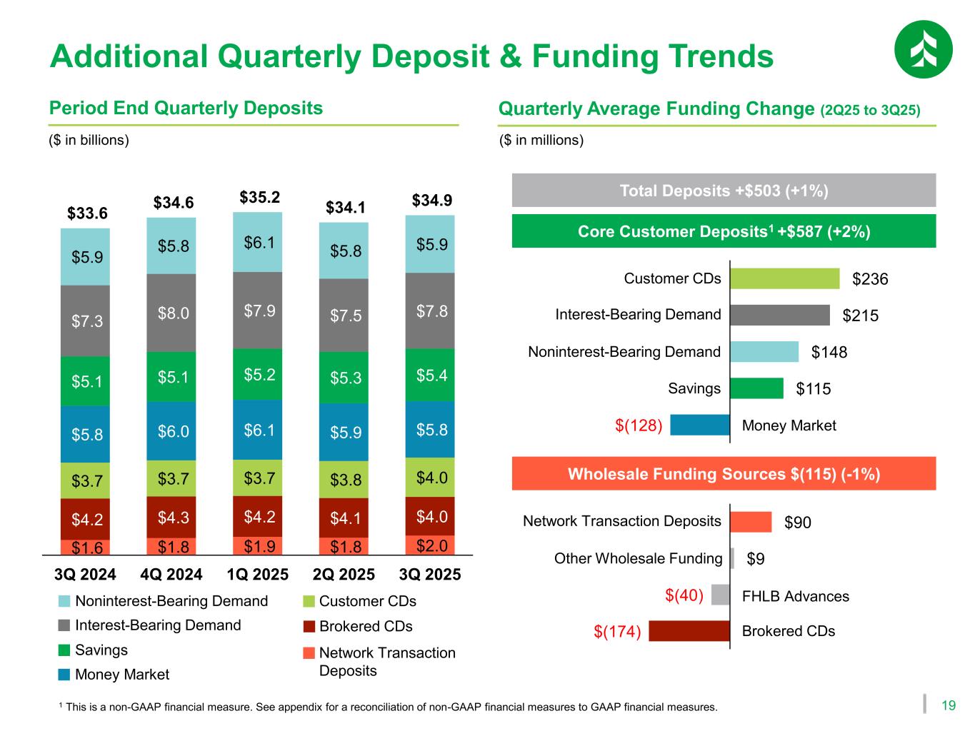 18 $3.6 $3.8 $3.8 $4.0 $4.0 $7.8 $7.0 $7.0 $6.9 $6.9 $7.2 $7.2 $7.4 $7.3 $7.3 $11.4 $11.7 $12.0 $12.4 $12.7 $30.0 $29.8 $30.3 $30.6 $31.0 3Q 2024 4Q 2024 1Q 2025 2Q 2025 3Q 2025 ($ in billions) Commercial & Business Lending Commercial Real Estate Residential Mortgage Auto Finance, Home Equity & Other Consumer ($ in millions) Average Loan Change (2Q 2025 to 3Q 2025)Period End Quarterly Loan Trends $(282) $(47) $(8) $19 $68 $122 $386 Commercial & Industrial Residential Mortgage Auto Finance CRE-Construction CRE-Investor Additional Quarterly Loan Trends Commercial & Business Lending Commercial Real Estate Residential Mortgage Auto Finance, Home Equity & Other Consumer CRE-Owner Occupied Home Equity & Other Consumer Total Loans +$258 (+1%)