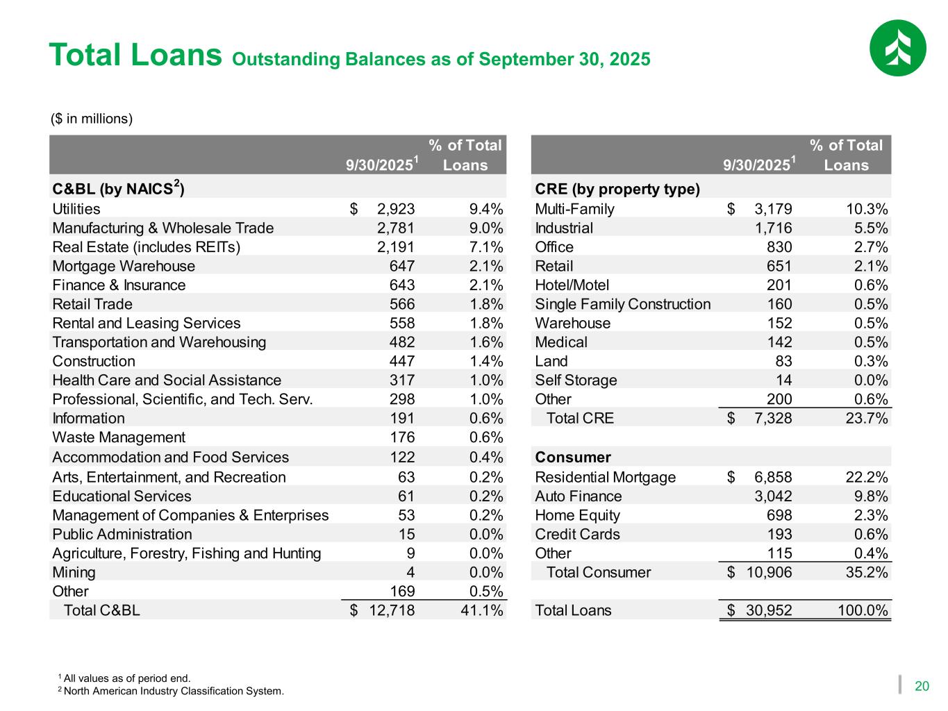 24 Period End Core Customer Deposits Reconciliation ($ in thousands) 3Q 2025 2Q 2025 1Q 2025 4Q 2024 3Q 2024 Total deposits $34,881,853 $34,147,565 $35,196,713 $34,648,434 $33,554,298 Less: Network transaction deposits 2,013,964 1,792,362 1,882,930 1,758,388 1,566,908 Less: Brokered CDs 3,956,517 4,072,048 4,197,512 4,276,309 4,242,670 Core customer deposits $28,911,371 $28,283,155 $29,116,271 $28,613,737 $27,744,719 Reconciliation & Definitions of Non-GAAP Items 1 The ratio tangible common equity to tangible assets excludes goodwill and other intangible assets, net. This financial measure has been included as it is considered to be a critical metric with which to analyze and evaluate financial condition and capital strength. Average Core Customer Deposits Reconciliation ($ in thousands) 3Q 2025 2Q 2025 1Q 2025 4Q 2024 3Q 2024 Average total deposits $34,705,887 $34,203,201 $34,833,464 $34,337,468 $33,320,825 Less: Average network transaction deposits 1,933,659 1,843,998 1,847,972 1,690,745 1,644,305 Less: Average brokered CDs 3,916,329 4,089,844 4,315,311 4,514,841 4,247,941 Average core customer deposits $28,855,899 $28,269,359 $28,670,181 $28,131,882 $27,428,578 Tangible Common Equity & Tangible Assets Reconciliation1 ($ in thousands) 3Q 2025 2Q 2025 1Q 2025 4Q 2024 3Q 2024 Common equity $4,674,186 $4,586,669 $4,492,446 $4,411,450 $4,219,125 Less: Goodwill and other intangible assets, net 1,130,044 1,132,247 1,134,450 1,136,653 1,138,855 Tangible common equity for TCE Ratio and TBV / share $3,544,142 $3,454,422 $3,357,996 $3,274,797 $3,080,269 Total assets $44,455,863 $43,993,729 $43,309,136 $43,023,068 $42,210,815 Less: Goodwill and other intangible assets, net 1,130,044 1,132,247 1,134,450 1,136,653 1,138,855 Tangible assets for TCE Ratio $43,325,819 $42,861,482 $42,174,686 $41,886,415 $41,071,960 Period End Loans Reconciliation ($ in thousands) 3Q 2025 Total loans $30,951,964 Mortgage portfolio loans sold in 1Q 2025 694,985 Total adjusted loans $31,646,949