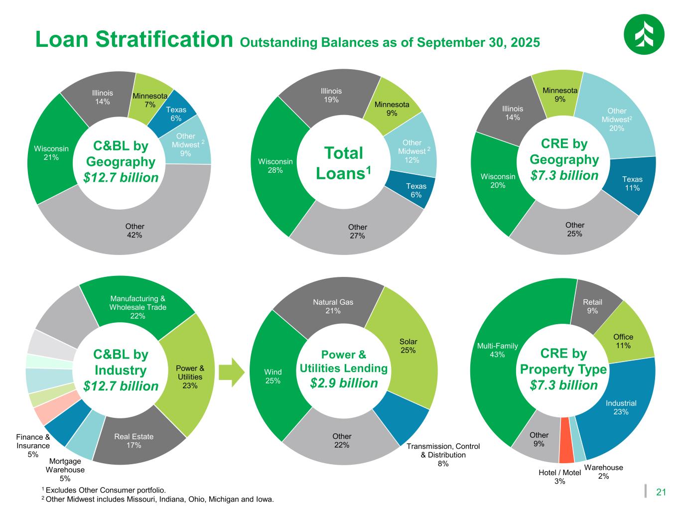 21 Multi-Family 43% Retail 9% Office 11% Industrial 23% Warehouse 2%Hotel / Motel 3% Other 9% Wisconsin 28% Illinois 19% Minnesota 9% Other Midwest 12% Texas 6% Other 27% Manufacturing & Wholesale Trade 22% Power & Utilities 23% Real Estate 17% Mortgage Warehouse 5% Finance & Insurance 5% 1 Excludes Other Consumer portfolio. 2 Other Midwest includes Missouri, Indiana, Ohio, Michigan and Iowa. Wind 25% Natural Gas 21% Solar 25% Transmission, Control & Distribution 8% Other 22% Wisconsin 21% Illinois 14% Minnesota 7% Texas 6% Other Midwest 9% Other 42% Wisconsin 20% Illinois 14% Minnesota 9% Other Midwest2 20% Texas 11% Other 25% 2 2 Loan Stratification Outstanding Balances as of September 30, 2025 C&BL by Geography $12.7 billion Power & Utilities Lending $2.9 billion C&BL by Industry $12.7 billion Total Loans1 CRE by Geography $7.3 billion CRE by Property Type $7.3 billion