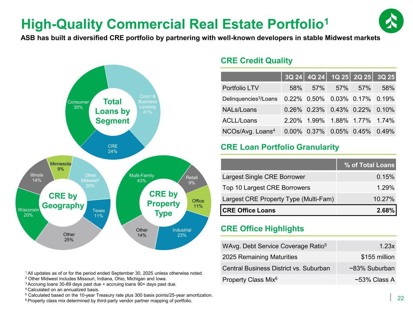 22 Multi-Family 43% Retail 9% Office 11% Industrial 23% Other 14% Consumer 35% Com'l & Business Lending 41% CRE 24% Wisconsin 20% Illinois 14% Minnesota 9% Other Midwest2 20% Texas 11% Other 25% 1 All updates as of or for the period ended September 30, 2025 unless otherwise noted. 2 Other Midwest includes Missouri, Indiana, Ohio, Michigan and Iowa. 3 Accruing loans 30-89 days past due + accruing loans 90+ days past due. 4 Calculated on an annualized basis. 5 Calculated based on the 10-year Treasury rate plus 300 basis points/25-year amortization. 6 Property class mix determined by third-party vendor partner mapping of portfolio. High-Quality Commercial Real Estate Portfolio1 3Q 24 4Q 24 1Q 25 2Q 25 3Q 25 Portfolio LTV 58% 57% 57% 57% 58% Delinquencies3/Loans 0.22% 0.50% 0.03% 0.17% 0.19% NALs/Loans 0.26% 0.23% 0.43% 0.22% 0.10% ACLL/Loans 2.20% 1.99% 1.88% 1.77% 1.74% NCOs/Avg. Loans4 0.00% 0.37% 0.05% 0.45% 0.49% CRE Credit Quality CRE Loan Portfolio Granularity % of Total Loans Largest Single CRE Borrower 0.15% Top 10 Largest CRE Borrowers 1.29% Largest CRE Property Type (Multi-Fam) 10.27% CRE Office Loans 2.68% CRE by Geography CRE by Property Type Total Loans by Segment CRE Office Highlights WAvg. Debt Service Coverage Ratio5 1.23x 2025 Remaining Maturities $155 million Central Business District vs. Suburban ~83% Suburban Property Class Mix6 ~53% Class A ASB has built a diversified CRE portfolio by partnering with well-known developers in stable Midwest markets