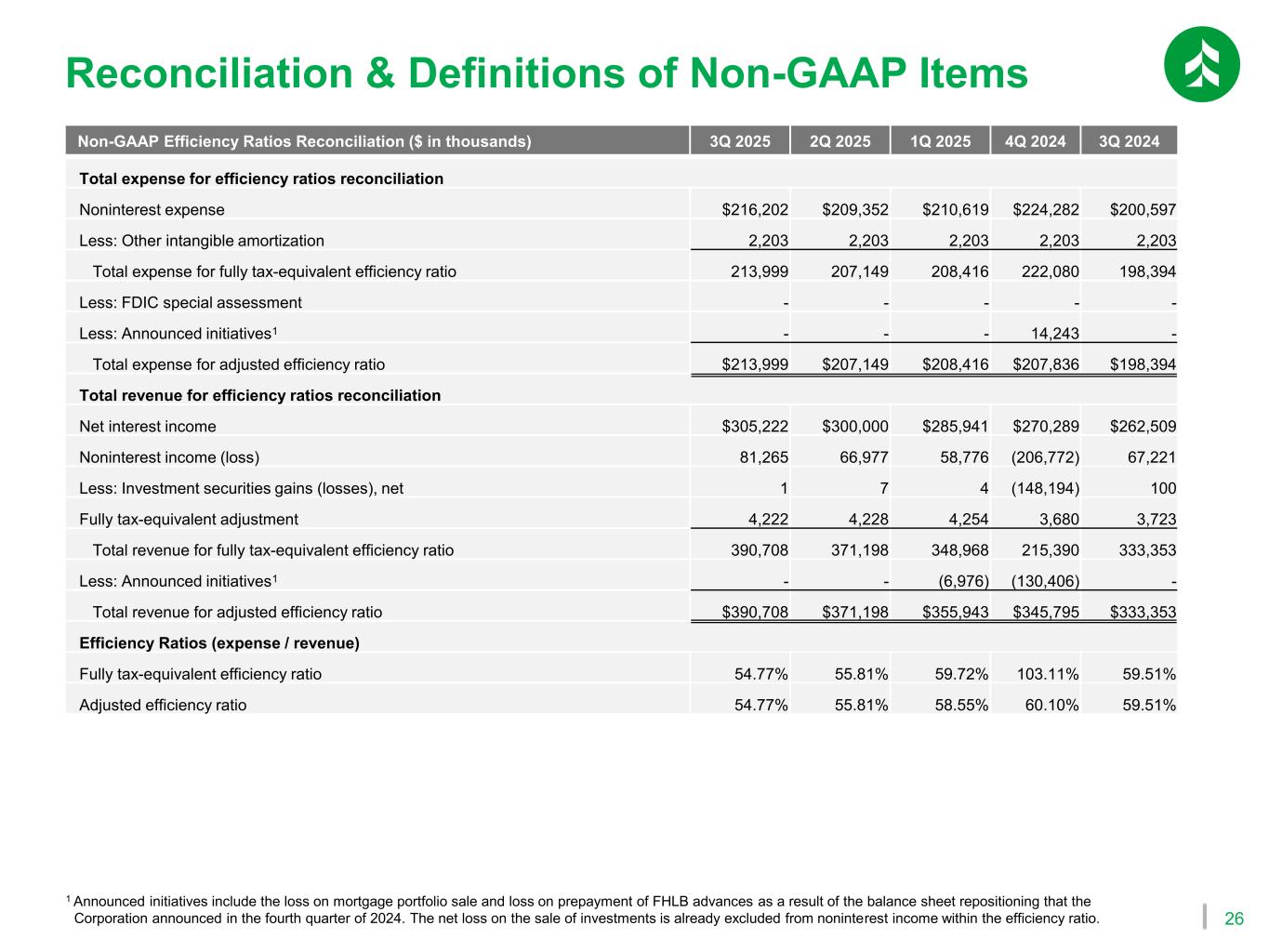 25 Return on Average Tangible Common Equity (ROATCE) Reconciliation ($ in thousands) 3Q 2025 2Q 2025 1Q 2025 4Q 2024 3Q 2024 Net income (loss) available to common equity $121,857 $108,355 $98,812 $(164,490) $85,143 Other intangible amortization, net of tax 1,652 1,652 1,652 1,652 1,652 Adjusted net income (loss) available to common equity for ROATCE1 $123,509 $110,007 $100,464 $(162,838) $86,795 Average common equity $4,627,038 $4,538,549 $4,436,467 $4,334,230 $4,136,615 Less: Average goodwill and other intangible assets, net 1,131,385 1,133,627 1,135,584 1,137,826 1,140,060 Average tangible common equity for ROATCE $3,495,653 $3,404,922 $3,300,883 $3,196,404 $2,996,555 Reconciliation & Definitions of Non-GAAP Items 1 Adjusted net income available to common equity, which is used in the calculation of return on average tangible common equity, adds back other intangible amortization, net of tax. 2 These items classified as nonrecurring items are the result of a balance sheet repositioning that the Corporation announced in the fourth quarter of 2024. Nonrecurring Item Noninterest Income Reconciliation ($ in thousands) YTD Sep 2025 1Q 2025 YTD Dec 2024 4Q 2024 GAAP noninterest income (loss) $207,019 $58,776 $(9,407) $(206,772) Less: Loss on mortgage portfolio sale2 (6,976) (6,976) (130,406) (130,406) Less: Net loss on sale of investments2 - - (148,183) (148,183) Noninterest income, excluding nonrecurring items $213,995 $65,752 $269,182 $71,816 Nonrecurring Item Noninterest Expense Reconciliation ($ in thousands) YTD Dec 2024 4Q 2024 GAAP noninterest expense $818,397 $224,282 Loss on prepayments of FHLB advances2 (14,243) (14,243) Noninterest expense, excluding nonrecurring items $804,154 $210,039