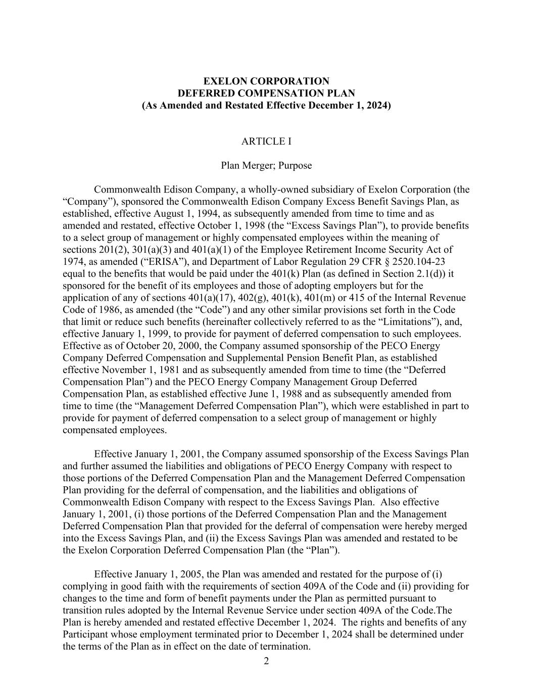 2 EXELON CORPORATION DEFERRED COMPENSATION PLAN (As Amended and Restated Effective December 1, 2024) ARTICLE I Plan Merger; Purpose Commonwealth Edison Company, a wholly-owned subsidiary of Exelon Corporation (the “Company”), sponsored the Commonwealth Edison Company Excess Benefit Savings Plan, as established, effective August 1, 1994, as subsequently amended from time to time and as amended and restated, effective October 1, 1998 (the “Excess Savings Plan”), to provide benefits to a select group of management or highly compensated employees within the meaning of sections 201(2), 301(a)(3) and 401(a)(1) of the Employee Retirement Income Security Act of 1974, as amended (“ERISA”), and Department of Labor Regulation 29 CFR § 2520.104-23 equal to the benefits that would be paid under the 401(k) Plan (as defined in Section 2.1(d)) it sponsored for the benefit of its employees and those of adopting employers but for the application of any of sections 401(a)(17), 402(g), 401(k), 401(m) or 415 of the Internal Revenue Code of 1986, as amended (the “Code”) and any other similar provisions set forth in the Code that limit or reduce such benefits (hereinafter collectively referred to as the “Limitations”), and, effective January 1, 1999, to provide for payment of deferred compensation to such employees. Effective as of October 20, 2000, the Company assumed sponsorship of the PECO Energy Company Deferred Compensation and Supplemental Pension Benefit Plan, as established effective November 1, 1981 and as subsequently amended from time to time (the “Deferred Compensation Plan”) and the PECO Energy Company Management Group Deferred Compensation Plan, as established effective June 1, 1988 and as subsequently amended from time to time (the “Management Deferred Compensation Plan”), which were established in part to provide for payment of deferred compensation to a select group of management or highly compensated employees. Effective January 1, 2001, the Company assumed sponsorship of the Excess Savings Plan and further assumed the liabilities and obligations of PECO Energy Company with respect to those portions of the Deferred Compensation Plan and the Management Deferred Compensation Plan providing for the deferral of compensation, and the liabilities and obligations of Commonwealth Edison Company with respect to the Excess Savings Plan. Also effective January 1, 2001, (i) those portions of the Deferred Compensation Plan and the Management Deferred Compensation Plan that provided for the deferral of compensation were hereby merged into the Excess Savings Plan, and (ii) the Excess Savings Plan was amended and restated to be the Exelon Corporation Deferred Compensation Plan (the “Plan”). Effective January 1, 2005, the Plan was amended and restated for the purpose of (i) complying in good faith with the requirements of section 409A of the Code and (ii) providing for changes to the time and form of benefit payments under the Plan as permitted pursuant to transition rules adopted by the Internal Revenue Service under section 409A of the Code.The Plan is hereby amended and restated effective December 1, 2024. The rights and benefits of any Participant whose employment terminated prior to December 1, 2024 shall be determined under the terms of the Plan as in effect on the date of termination.