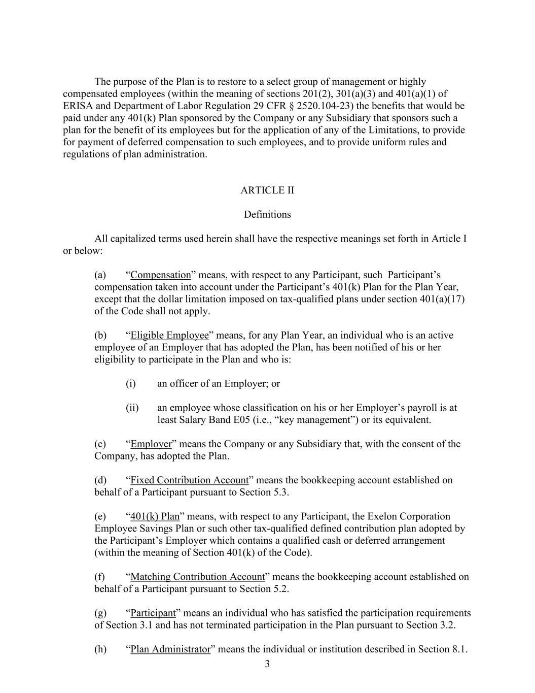 3 The purpose of the Plan is to restore to a select group of management or highly compensated employees (within the meaning of sections 201(2), 301(a)(3) and 401(a)(1) of ERISA and Department of Labor Regulation 29 CFR § 2520.104-23) the benefits that would be paid under any 401(k) Plan sponsored by the Company or any Subsidiary that sponsors such a plan for the benefit of its employees but for the application of any of the Limitations, to provide for payment of deferred compensation to such employees, and to provide uniform rules and regulations of plan administration. ARTICLE II Definitions All capitalized terms used herein shall have the respective meanings set forth in Article I or below: (a) “Compensation” means, with respect to any Participant, such Participant’s compensation taken into account under the Participant’s 401(k) Plan for the Plan Year, except that the dollar limitation imposed on tax-qualified plans under section 401(a)(17) of the Code shall not apply. (b) “Eligible Employee” means, for any Plan Year, an individual who is an active employee of an Employer that has adopted the Plan, has been notified of his or her eligibility to participate in the Plan and who is: (i) an officer of an Employer; or (ii) an employee whose classification on his or her Employer’s payroll is at least Salary Band E05 (i.e., “key management”) or its equivalent. (c) “Employer” means the Company or any Subsidiary that, with the consent of the Company, has adopted the Plan. (d) “Fixed Contribution Account” means the bookkeeping account established on behalf of a Participant pursuant to Section 5.3. (e) “401(k) Plan” means, with respect to any Participant, the Exelon Corporation Employee Savings Plan or such other tax-qualified defined contribution plan adopted by the Participant’s Employer which contains a qualified cash or deferred arrangement (within the meaning of Section 401(k) of the Code). (f) “Matching Contribution Account” means the bookkeeping account established on behalf of a Participant pursuant to Section 5.2. (g) “Participant” means an individual who has satisfied the participation requirements of Section 3.1 and has not terminated participation in the Plan pursuant to Section 3.2. (h) “Plan Administrator” means the individual or institution described in Section 8.1.
