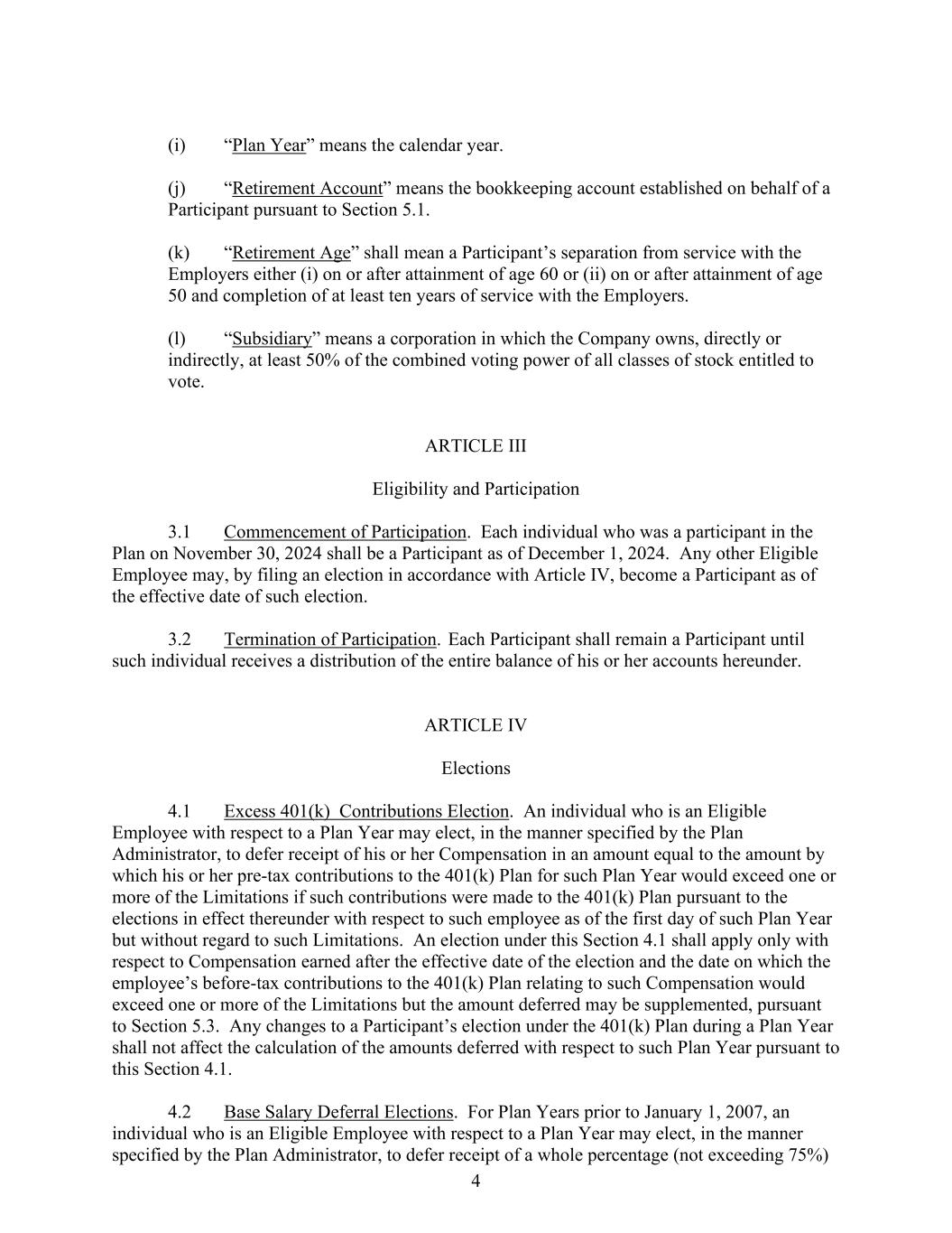 4 (i) “Plan Year” means the calendar year. (j) “Retirement Account” means the bookkeeping account established on behalf of a Participant pursuant to Section 5.1. (k) “Retirement Age” shall mean a Participant’s separation from service with the Employers either (i) on or after attainment of age 60 or (ii) on or after attainment of age 50 and completion of at least ten years of service with the Employers. (l) “Subsidiary” means a corporation in which the Company owns, directly or indirectly, at least 50% of the combined voting power of all classes of stock entitled to vote. ARTICLE III Eligibility and Participation 3.1 Commencement of Participation. Each individual who was a participant in the Plan on November 30, 2024 shall be a Participant as of December 1, 2024. Any other Eligible Employee may, by filing an election in accordance with Article IV, become a Participant as of the effective date of such election. 3.2 Termination of Participation. Each Participant shall remain a Participant until such individual receives a distribution of the entire balance of his or her accounts hereunder. ARTICLE IV Elections 4.1 Excess 401(k) Contributions Election. An individual who is an Eligible Employee with respect to a Plan Year may elect, in the manner specified by the Plan Administrator, to defer receipt of his or her Compensation in an amount equal to the amount by which his or her pre-tax contributions to the 401(k) Plan for such Plan Year would exceed one or more of the Limitations if such contributions were made to the 401(k) Plan pursuant to the elections in effect thereunder with respect to such employee as of the first day of such Plan Year but without regard to such Limitations. An election under this Section 4.1 shall apply only with respect to Compensation earned after the effective date of the election and the date on which the employee’s before-tax contributions to the 401(k) Plan relating to such Compensation would exceed one or more of the Limitations but the amount deferred may be supplemented, pursuant to Section 5.3. Any changes to a Participant’s election under the 401(k) Plan during a Plan Year shall not affect the calculation of the amounts deferred with respect to such Plan Year pursuant to this Section 4.1. 4.2 Base Salary Deferral Elections. For Plan Years prior to January 1, 2007, an individual who is an Eligible Employee with respect to a Plan Year may elect, in the manner specified by the Plan Administrator, to defer receipt of a whole percentage (not exceeding 75%)