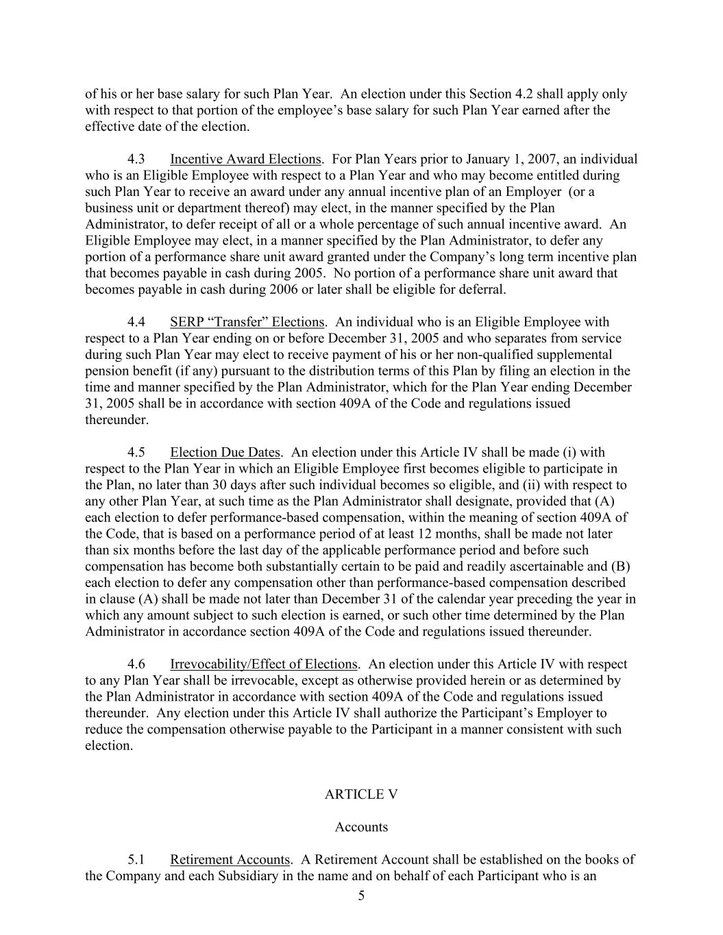 5 of his or her base salary for such Plan Year. An election under this Section 4.2 shall apply only with respect to that portion of the employee’s base salary for such Plan Year earned after the effective date of the election. 4.3 Incentive Award Elections. For Plan Years prior to January 1, 2007, an individual who is an Eligible Employee with respect to a Plan Year and who may become entitled during such Plan Year to receive an award under any annual incentive plan of an Employer (or a business unit or department thereof) may elect, in the manner specified by the Plan Administrator, to defer receipt of all or a whole percentage of such annual incentive award. An Eligible Employee may elect, in a manner specified by the Plan Administrator, to defer any portion of a performance share unit award granted under the Company’s long term incentive plan that becomes payable in cash during 2005. No portion of a performance share unit award that becomes payable in cash during 2006 or later shall be eligible for deferral. 4.4 SERP “Transfer” Elections. An individual who is an Eligible Employee with respect to a Plan Year ending on or before December 31, 2005 and who separates from service during such Plan Year may elect to receive payment of his or her non-qualified supplemental pension benefit (if any) pursuant to the distribution terms of this Plan by filing an election in the time and manner specified by the Plan Administrator, which for the Plan Year ending December 31, 2005 shall be in accordance with section 409A of the Code and regulations issued thereunder. 4.5 Election Due Dates. An election under this Article IV shall be made (i) with respect to the Plan Year in which an Eligible Employee first becomes eligible to participate in the Plan, no later than 30 days after such individual becomes so eligible, and (ii) with respect to any other Plan Year, at such time as the Plan Administrator shall designate, provided that (A) each election to defer performance-based compensation, within the meaning of section 409A of the Code, that is based on a performance period of at least 12 months, shall be made not later than six months before the last day of the applicable performance period and before such compensation has become both substantially certain to be paid and readily ascertainable and (B) each election to defer any compensation other than performance-based compensation described in clause (A) shall be made not later than December 31 of the calendar year preceding the year in which any amount subject to such election is earned, or such other time determined by the Plan Administrator in accordance section 409A of the Code and regulations issued thereunder. 4.6 Irrevocability/Effect of Elections. An election under this Article IV with respect to any Plan Year shall be irrevocable, except as otherwise provided herein or as determined by the Plan Administrator in accordance with section 409A of the Code and regulations issued thereunder. Any election under this Article IV shall authorize the Participant’s Employer to reduce the compensation otherwise payable to the Participant in a manner consistent with such election. ARTICLE V Accounts 5.1 Retirement Accounts. A Retirement Account shall be established on the books of the Company and each Subsidiary in the name and on behalf of each Participant who is an