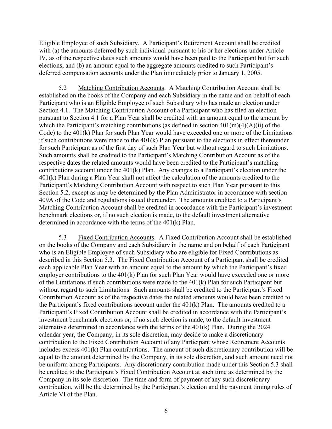 6 Eligible Employee of such Subsidiary. A Participant’s Retirement Account shall be credited with (a) the amounts deferred by such individual pursuant to his or her elections under Article IV, as of the respective dates such amounts would have been paid to the Participant but for such elections, and (b) an amount equal to the aggregate amounts credited to such Participant’s deferred compensation accounts under the Plan immediately prior to January 1, 2005. 5.2 Matching Contribution Accounts. A Matching Contribution Account shall be established on the books of the Company and each Subsidiary in the name and on behalf of each Participant who is an Eligible Employee of such Subsidiary who has made an election under Section 4.1. The Matching Contribution Account of a Participant who has filed an election pursuant to Section 4.1 for a Plan Year shall be credited with an amount equal to the amount by which the Participant’s matching contributions (as defined in section 401(m)(4)(A)(ii) of the Code) to the 401(k) Plan for such Plan Year would have exceeded one or more of the Limitations if such contributions were made to the 401(k) Plan pursuant to the elections in effect thereunder for such Participant as of the first day of such Plan Year but without regard to such Limitations. Such amounts shall be credited to the Participant’s Matching Contribution Account as of the respective dates the related amounts would have been credited to the Participant’s matching contributions account under the 401(k) Plan. Any changes to a Participant’s election under the 401(k) Plan during a Plan Year shall not affect the calculation of the amounts credited to the Participant’s Matching Contribution Account with respect to such Plan Year pursuant to this Section 5.2, except as may be determined by the Plan Administrator in accordance with section 409A of the Code and regulations issued thereunder. The amounts credited to a Participant’s Matching Contribution Account shall be credited in accordance with the Participant’s investment benchmark elections or, if no such election is made, to the default investment alternative determined in accordance with the terms of the 401(k) Plan. 5.3 Fixed Contribution Accounts. A Fixed Contribution Account shall be established on the books of the Company and each Subsidiary in the name and on behalf of each Participant who is an Eligible Employee of such Subsidiary who are eligible for Fixed Contributions as described in this Section 5.3. The Fixed Contribution Account of a Participant shall be credited each applicable Plan Year with an amount equal to the amount by which the Participant’s fixed employer contributions to the 401(k) Plan for such Plan Year would have exceeded one or more of the Limitations if such contributions were made to the 401(k) Plan for such Participant but without regard to such Limitations. Such amounts shall be credited to the Participant’s Fixed Contribution Account as of the respective dates the related amounts would have been credited to the Participant’s fixed contributions account under the 401(k) Plan. The amounts credited to a Participant’s Fixed Contribution Account shall be credited in accordance with the Participant’s investment benchmark elections or, if no such election is made, to the default investment alternative determined in accordance with the terms of the 401(k) Plan. During the 2024 calendar year, the Company, in its sole discretion, may decide to make a discretionary contribution to the Fixed Contribution Account of any Participant whose Retirement Accounts includes excess 401(k) Plan contributions. The amount of such discretionary contribution will be equal to the amount determined by the Company, in its sole discretion, and such amount need not be uniform among Participants. Any discretionary contribution made under this Section 5.3 shall be credited to the Participant’s Fixed Contribution Account at such time as determined by the Company in its sole discretion. The time and form of payment of any such discretionary contribution, will be the determined by the Participant’s election and the payment timing rules of Article VI of the Plan.