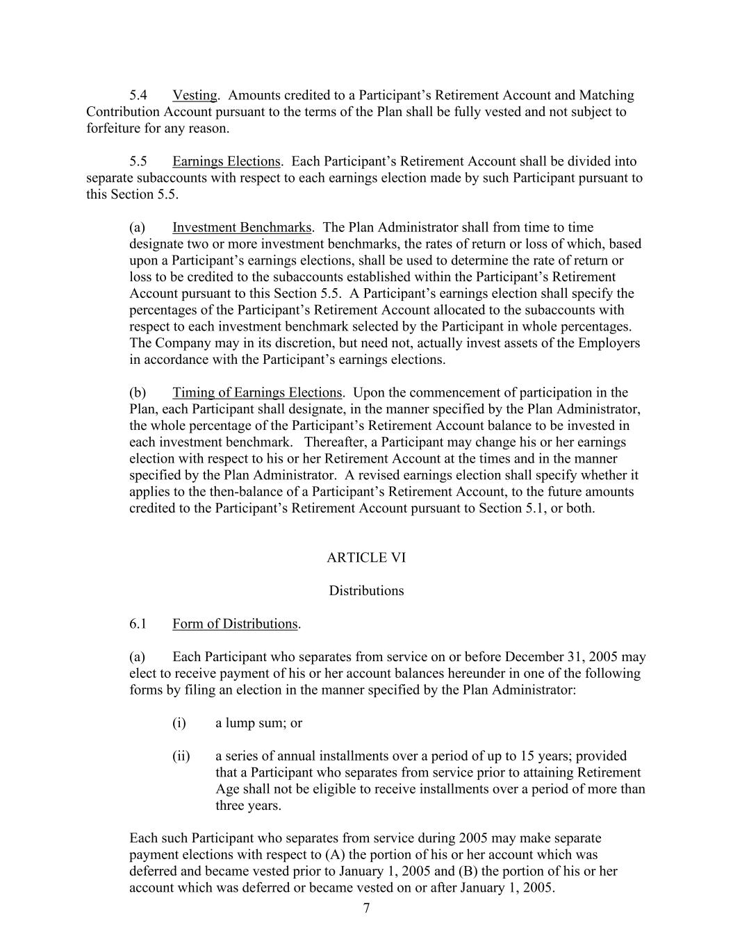 7 5.4 Vesting. Amounts credited to a Participant’s Retirement Account and Matching Contribution Account pursuant to the terms of the Plan shall be fully vested and not subject to forfeiture for any reason. 5.5 Earnings Elections. Each Participant’s Retirement Account shall be divided into separate subaccounts with respect to each earnings election made by such Participant pursuant to this Section 5.5. (a) Investment Benchmarks. The Plan Administrator shall from time to time designate two or more investment benchmarks, the rates of return or loss of which, based upon a Participant’s earnings elections, shall be used to determine the rate of return or loss to be credited to the subaccounts established within the Participant’s Retirement Account pursuant to this Section 5.5. A Participant’s earnings election shall specify the percentages of the Participant’s Retirement Account allocated to the subaccounts with respect to each investment benchmark selected by the Participant in whole percentages. The Company may in its discretion, but need not, actually invest assets of the Employers in accordance with the Participant’s earnings elections. (b) Timing of Earnings Elections. Upon the commencement of participation in the Plan, each Participant shall designate, in the manner specified by the Plan Administrator, the whole percentage of the Participant’s Retirement Account balance to be invested in each investment benchmark. Thereafter, a Participant may change his or her earnings election with respect to his or her Retirement Account at the times and in the manner specified by the Plan Administrator. A revised earnings election shall specify whether it applies to the then-balance of a Participant’s Retirement Account, to the future amounts credited to the Participant’s Retirement Account pursuant to Section 5.1, or both. ARTICLE VI Distributions 6.1 Form of Distributions. (a) Each Participant who separates from service on or before December 31, 2005 may elect to receive payment of his or her account balances hereunder in one of the following forms by filing an election in the manner specified by the Plan Administrator: (i) a lump sum; or (ii) a series of annual installments over a period of up to 15 years; provided that a Participant who separates from service prior to attaining Retirement Age shall not be eligible to receive installments over a period of more than three years. Each such Participant who separates from service during 2005 may make separate payment elections with respect to (A) the portion of his or her account which was deferred and became vested prior to January 1, 2005 and (B) the portion of his or her account which was deferred or became vested on or after January 1, 2005.