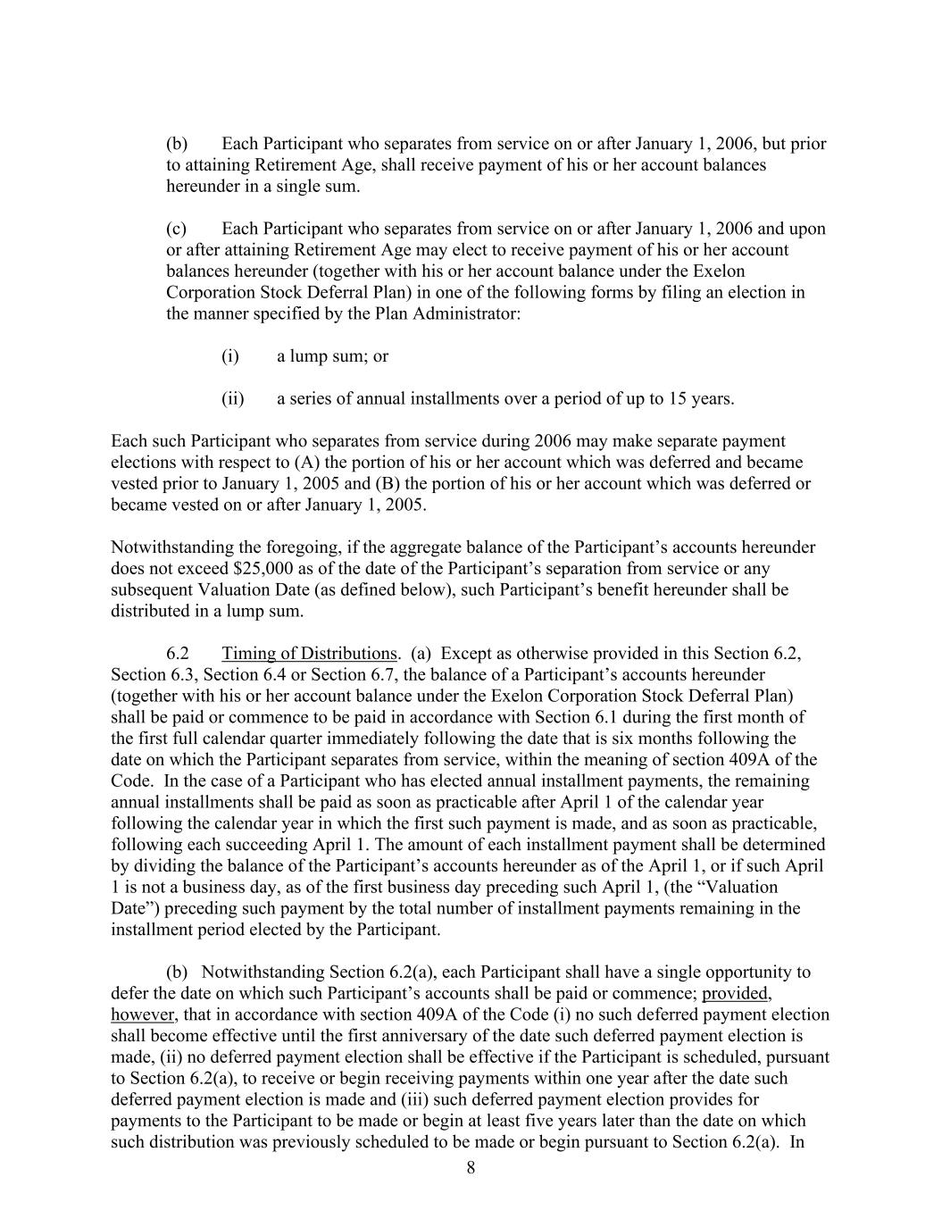 8 (b) Each Participant who separates from service on or after January 1, 2006, but prior to attaining Retirement Age, shall receive payment of his or her account balances hereunder in a single sum. (c) Each Participant who separates from service on or after January 1, 2006 and upon or after attaining Retirement Age may elect to receive payment of his or her account balances hereunder (together with his or her account balance under the Exelon Corporation Stock Deferral Plan) in one of the following forms by filing an election in the manner specified by the Plan Administrator: (i) a lump sum; or (ii) a series of annual installments over a period of up to 15 years. Each such Participant who separates from service during 2006 may make separate payment elections with respect to (A) the portion of his or her account which was deferred and became vested prior to January 1, 2005 and (B) the portion of his or her account which was deferred or became vested on or after January 1, 2005. Notwithstanding the foregoing, if the aggregate balance of the Participant’s accounts hereunder does not exceed $25,000 as of the date of the Participant’s separation from service or any subsequent Valuation Date (as defined below), such Participant’s benefit hereunder shall be distributed in a lump sum. 6.2 Timing of Distributions. (a) Except as otherwise provided in this Section 6.2, Section 6.3, Section 6.4 or Section 6.7, the balance of a Participant’s accounts hereunder (together with his or her account balance under the Exelon Corporation Stock Deferral Plan) shall be paid or commence to be paid in accordance with Section 6.1 during the first month of the first full calendar quarter immediately following the date that is six months following the date on which the Participant separates from service, within the meaning of section 409A of the Code. In the case of a Participant who has elected annual installment payments, the remaining annual installments shall be paid as soon as practicable after April 1 of the calendar year following the calendar year in which the first such payment is made, and as soon as practicable, following each succeeding April 1. The amount of each installment payment shall be determined by dividing the balance of the Participant’s accounts hereunder as of the April 1, or if such April 1 is not a business day, as of the first business day preceding such April 1, (the “Valuation Date”) preceding such payment by the total number of installment payments remaining in the installment period elected by the Participant. (b) Notwithstanding Section 6.2(a), each Participant shall have a single opportunity to defer the date on which such Participant’s accounts shall be paid or commence; provided, however, that in accordance with section 409A of the Code (i) no such deferred payment election shall become effective until the first anniversary of the date such deferred payment election is made, (ii) no deferred payment election shall be effective if the Participant is scheduled, pursuant to Section 6.2(a), to receive or begin receiving payments within one year after the date such deferred payment election is made and (iii) such deferred payment election provides for payments to the Participant to be made or begin at least five years later than the date on which such distribution was previously scheduled to be made or begin pursuant to Section 6.2(a). In