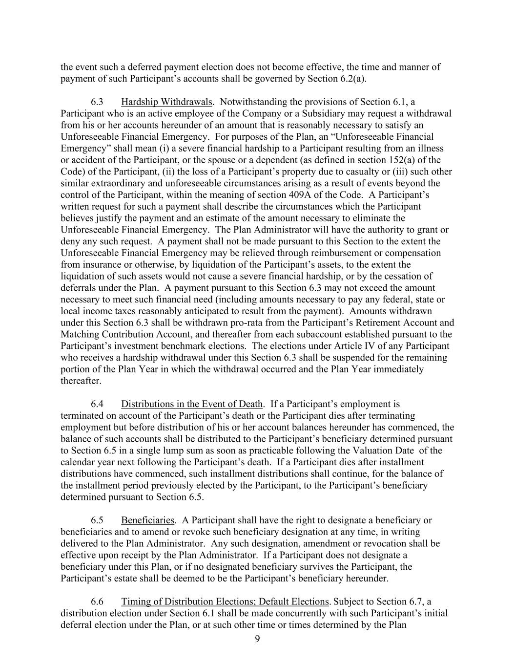 9 the event such a deferred payment election does not become effective, the time and manner of payment of such Participant’s accounts shall be governed by Section 6.2(a). 6.3 Hardship Withdrawals. Notwithstanding the provisions of Section 6.1, a Participant who is an active employee of the Company or a Subsidiary may request a withdrawal from his or her accounts hereunder of an amount that is reasonably necessary to satisfy an Unforeseeable Financial Emergency. For purposes of the Plan, an “Unforeseeable Financial Emergency” shall mean (i) a severe financial hardship to a Participant resulting from an illness or accident of the Participant, or the spouse or a dependent (as defined in section 152(a) of the Code) of the Participant, (ii) the loss of a Participant’s property due to casualty or (iii) such other similar extraordinary and unforeseeable circumstances arising as a result of events beyond the control of the Participant, within the meaning of section 409A of the Code. A Participant’s written request for such a payment shall describe the circumstances which the Participant believes justify the payment and an estimate of the amount necessary to eliminate the Unforeseeable Financial Emergency. The Plan Administrator will have the authority to grant or deny any such request. A payment shall not be made pursuant to this Section to the extent the Unforeseeable Financial Emergency may be relieved through reimbursement or compensation from insurance or otherwise, by liquidation of the Participant’s assets, to the extent the liquidation of such assets would not cause a severe financial hardship, or by the cessation of deferrals under the Plan. A payment pursuant to this Section 6.3 may not exceed the amount necessary to meet such financial need (including amounts necessary to pay any federal, state or local income taxes reasonably anticipated to result from the payment). Amounts withdrawn under this Section 6.3 shall be withdrawn pro-rata from the Participant’s Retirement Account and Matching Contribution Account, and thereafter from each subaccount established pursuant to the Participant’s investment benchmark elections. The elections under Article IV of any Participant who receives a hardship withdrawal under this Section 6.3 shall be suspended for the remaining portion of the Plan Year in which the withdrawal occurred and the Plan Year immediately thereafter. 6.4 Distributions in the Event of Death. If a Participant’s employment is terminated on account of the Participant’s death or the Participant dies after terminating employment but before distribution of his or her account balances hereunder has commenced, the balance of such accounts shall be distributed to the Participant’s beneficiary determined pursuant to Section 6.5 in a single lump sum as soon as practicable following the Valuation Date of the calendar year next following the Participant’s death. If a Participant dies after installment distributions have commenced, such installment distributions shall continue, for the balance of the installment period previously elected by the Participant, to the Participant’s beneficiary determined pursuant to Section 6.5. 6.5 Beneficiaries. A Participant shall have the right to designate a beneficiary or beneficiaries and to amend or revoke such beneficiary designation at any time, in writing delivered to the Plan Administrator. Any such designation, amendment or revocation shall be effective upon receipt by the Plan Administrator. If a Participant does not designate a beneficiary under this Plan, or if no designated beneficiary survives the Participant, the Participant’s estate shall be deemed to be the Participant’s beneficiary hereunder. 6.6 Timing of Distribution Elections; Default Elections. Subject to Section 6.7, a distribution election under Section 6.1 shall be made concurrently with such Participant’s initial deferral election under the Plan, or at such other time or times determined by the Plan