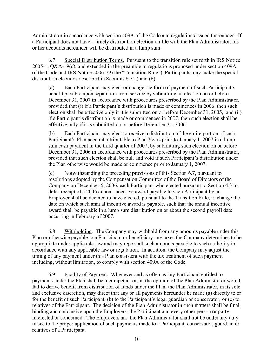 10 Administrator in accordance with section 409A of the Code and regulations issued thereunder. If a Participant does not have a timely distribution election on file with the Plan Administrator, his or her accounts hereunder will be distributed in a lump sum. 6.7 Special Distribution Terms. Pursuant to the transition rule set forth in IRS Notice 2005-1, Q&A-19(c), and extended in the preamble to regulations proposed under section 409A of the Code and IRS Notice 2006-79 (the “Transition Rule”), Participants may make the special distribution elections described in Sections 6.7(a) and (b). (a) Each Participant may elect or change the form of payment of such Participant’s benefit payable upon separation from service by submitting an election on or before December 31, 2007 in accordance with procedures prescribed by the Plan Administrator, provided that (i) if a Participant’s distribution is made or commences in 2006, then such election shall be effective only if it is submitted on or before December 31, 2005, and (ii) if a Participant’s distribution is made or commences in 2007, then such election shall be effective only if it is submitted on or before December 31, 2006. (b) Each Participant may elect to receive a distribution of the entire portion of such Participant’s Plan account attributable to Plan Years prior to January 1, 2007 in a lump sum cash payment in the third quarter of 2007, by submitting such election on or before December 31, 2006 in accordance with procedures prescribed by the Plan Administrator, provided that such election shall be null and void if such Participant’s distribution under the Plan otherwise would be made or commence prior to January 1, 2007. (c) Notwithstanding the preceding provisions of this Section 6.7, pursuant to resolutions adopted by the Compensation Committee of the Board of Directors of the Company on December 5, 2006, each Participant who elected pursuant to Section 4.3 to defer receipt of a 2006 annual incentive award payable to such Participant by an Employer shall be deemed to have elected, pursuant to the Transition Rule, to change the date on which such annual incentive award is payable, such that the annual incentive award shall be payable in a lump sum distribution on or about the second payroll date occurring in February of 2007. 6.8 Withholding. The Company may withhold from any amounts payable under this Plan or otherwise payable to a Participant or beneficiary any taxes the Company determines to be appropriate under applicable law and may report all such amounts payable to such authority in accordance with any applicable law or regulation. In addition, the Company may adjust the timing of any payment under this Plan consistent with the tax treatment of such payment including, without limitation, to comply with section 409A of the Code. 6.9 Facility of Payment. Whenever and as often as any Participant entitled to payments under the Plan shall be incompetent or, in the opinion of the Plan Administrator would fail to derive benefit from distribution of funds under the Plan, the Plan Administrator, in its sole and exclusive discretion, may direct that any or all payments hereunder be made (a) directly to or for the benefit of such Participant, (b) to the Participant’s legal guardian or conservator; or (c) to relatives of the Participant. The decision of the Plan Administrator in such matters shall be final, binding and conclusive upon the Employers, the Participant and every other person or party interested or concerned. The Employers and the Plan Administrator shall not be under any duty to see to the proper application of such payments made to a Participant, conservator, guardian or relatives of a Participant.