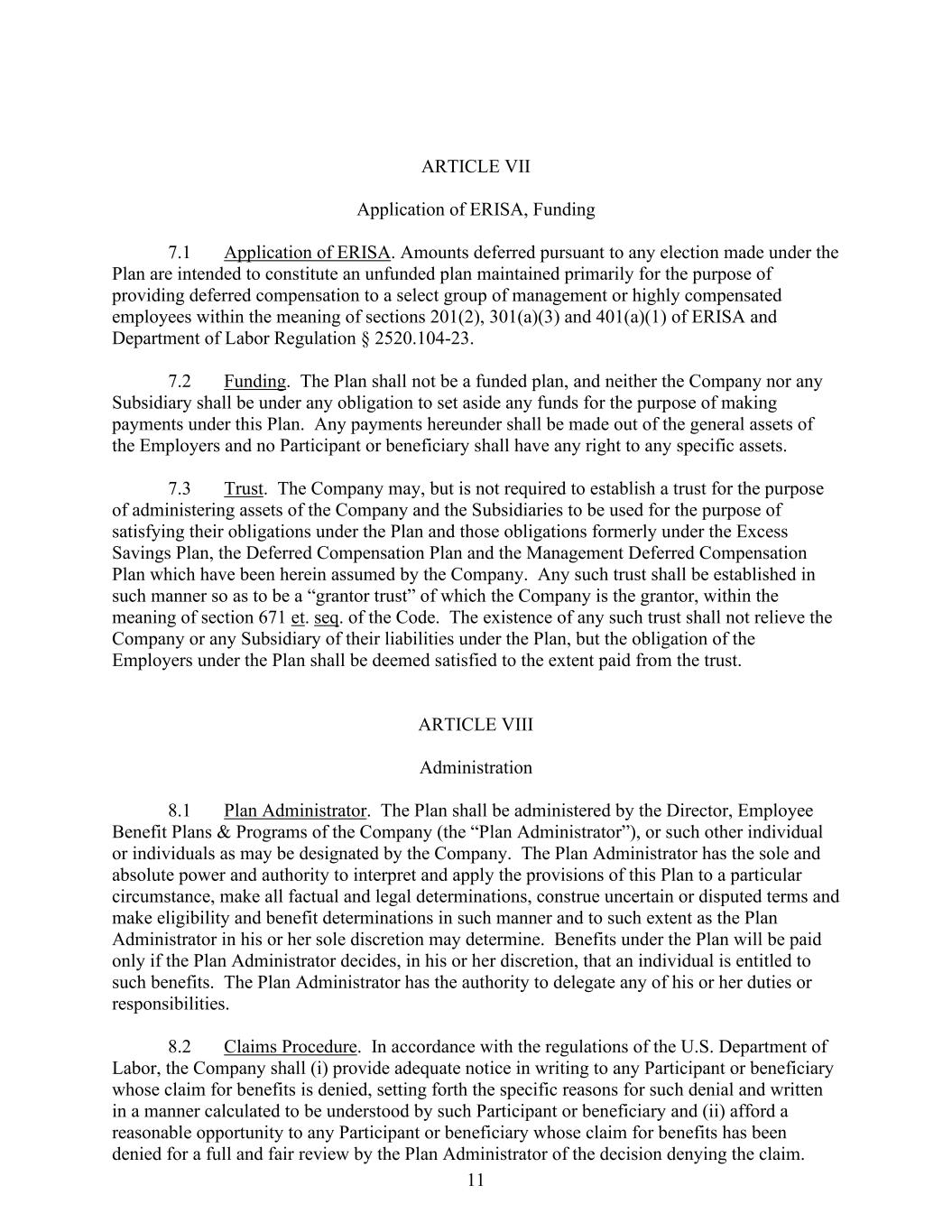 11 ARTICLE VII Application of ERISA, Funding 7.1 Application of ERISA. Amounts deferred pursuant to any election made under the Plan are intended to constitute an unfunded plan maintained primarily for the purpose of providing deferred compensation to a select group of management or highly compensated employees within the meaning of sections 201(2), 301(a)(3) and 401(a)(1) of ERISA and Department of Labor Regulation § 2520.104-23. 7.2 Funding. The Plan shall not be a funded plan, and neither the Company nor any Subsidiary shall be under any obligation to set aside any funds for the purpose of making payments under this Plan. Any payments hereunder shall be made out of the general assets of the Employers and no Participant or beneficiary shall have any right to any specific assets. 7.3 Trust. The Company may, but is not required to establish a trust for the purpose of administering assets of the Company and the Subsidiaries to be used for the purpose of satisfying their obligations under the Plan and those obligations formerly under the Excess Savings Plan, the Deferred Compensation Plan and the Management Deferred Compensation Plan which have been herein assumed by the Company. Any such trust shall be established in such manner so as to be a “grantor trust” of which the Company is the grantor, within the meaning of section 671 et. seq. of the Code. The existence of any such trust shall not relieve the Company or any Subsidiary of their liabilities under the Plan, but the obligation of the Employers under the Plan shall be deemed satisfied to the extent paid from the trust. ARTICLE VIII Administration 8.1 Plan Administrator. The Plan shall be administered by the Director, Employee Benefit Plans & Programs of the Company (the “Plan Administrator”), or such other individual or individuals as may be designated by the Company. The Plan Administrator has the sole and absolute power and authority to interpret and apply the provisions of this Plan to a particular circumstance, make all factual and legal determinations, construe uncertain or disputed terms and make eligibility and benefit determinations in such manner and to such extent as the Plan Administrator in his or her sole discretion may determine. Benefits under the Plan will be paid only if the Plan Administrator decides, in his or her discretion, that an individual is entitled to such benefits. The Plan Administrator has the authority to delegate any of his or her duties or responsibilities. 8.2 Claims Procedure. In accordance with the regulations of the U.S. Department of Labor, the Company shall (i) provide adequate notice in writing to any Participant or beneficiary whose claim for benefits is denied, setting forth the specific reasons for such denial and written in a manner calculated to be understood by such Participant or beneficiary and (ii) afford a reasonable opportunity to any Participant or beneficiary whose claim for benefits has been denied for a full and fair review by the Plan Administrator of the decision denying the claim.