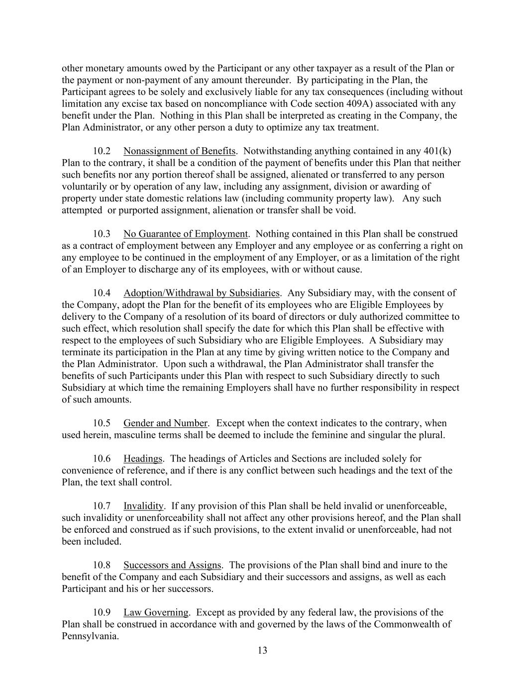 13 other monetary amounts owed by the Participant or any other taxpayer as a result of the Plan or the payment or non-payment of any amount thereunder. By participating in the Plan, the Participant agrees to be solely and exclusively liable for any tax consequences (including without limitation any excise tax based on noncompliance with Code section 409A) associated with any benefit under the Plan. Nothing in this Plan shall be interpreted as creating in the Company, the Plan Administrator, or any other person a duty to optimize any tax treatment. 10.2 Nonassignment of Benefits. Notwithstanding anything contained in any 401(k) Plan to the contrary, it shall be a condition of the payment of benefits under this Plan that neither such benefits nor any portion thereof shall be assigned, alienated or transferred to any person voluntarily or by operation of any law, including any assignment, division or awarding of property under state domestic relations law (including community property law). Any such attempted or purported assignment, alienation or transfer shall be void. 10.3 No Guarantee of Employment. Nothing contained in this Plan shall be construed as a contract of employment between any Employer and any employee or as conferring a right on any employee to be continued in the employment of any Employer, or as a limitation of the right of an Employer to discharge any of its employees, with or without cause. 10.4 Adoption/Withdrawal by Subsidiaries. Any Subsidiary may, with the consent of the Company, adopt the Plan for the benefit of its employees who are Eligible Employees by delivery to the Company of a resolution of its board of directors or duly authorized committee to such effect, which resolution shall specify the date for which this Plan shall be effective with respect to the employees of such Subsidiary who are Eligible Employees. A Subsidiary may terminate its participation in the Plan at any time by giving written notice to the Company and the Plan Administrator. Upon such a withdrawal, the Plan Administrator shall transfer the benefits of such Participants under this Plan with respect to such Subsidiary directly to such Subsidiary at which time the remaining Employers shall have no further responsibility in respect of such amounts. 10.5 Gender and Number. Except when the context indicates to the contrary, when used herein, masculine terms shall be deemed to include the feminine and singular the plural. 10.6 Headings. The headings of Articles and Sections are included solely for convenience of reference, and if there is any conflict between such headings and the text of the Plan, the text shall control. 10.7 Invalidity. If any provision of this Plan shall be held invalid or unenforceable, such invalidity or unenforceability shall not affect any other provisions hereof, and the Plan shall be enforced and construed as if such provisions, to the extent invalid or unenforceable, had not been included. 10.8 Successors and Assigns. The provisions of the Plan shall bind and inure to the benefit of the Company and each Subsidiary and their successors and assigns, as well as each Participant and his or her successors. 10.9 Law Governing. Except as provided by any federal law, the provisions of the Plan shall be construed in accordance with and governed by the laws of the Commonwealth of Pennsylvania.