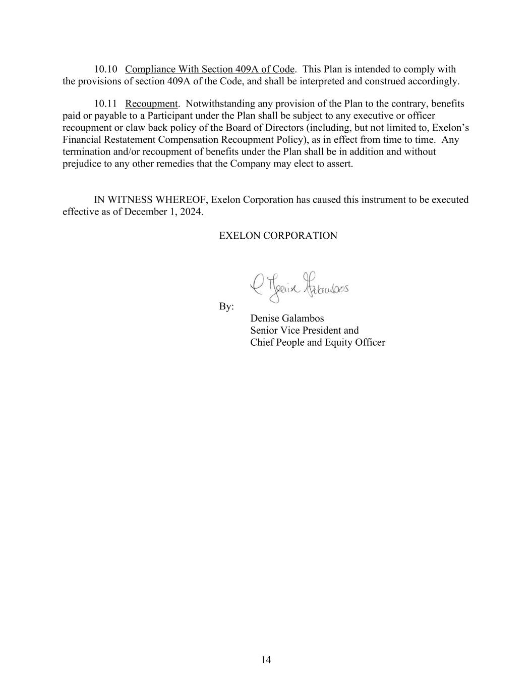 14 10.10 Compliance With Section 409A of Code. This Plan is intended to comply with the provisions of section 409A of the Code, and shall be interpreted and construed accordingly. 10.11 Recoupment. Notwithstanding any provision of the Plan to the contrary, benefits paid or payable to a Participant under the Plan shall be subject to any executive or officer recoupment or claw back policy of the Board of Directors (including, but not limited to, Exelon’s Financial Restatement Compensation Recoupment Policy), as in effect from time to time. Any termination and/or recoupment of benefits under the Plan shall be in addition and without prejudice to any other remedies that the Company may elect to assert. IN WITNESS WHEREOF, Exelon Corporation has caused this instrument to be executed effective as of December 1, 2024. EXELON CORPORATION By: Denise Galambos Senior Vice President and Chief People and Equity Officer