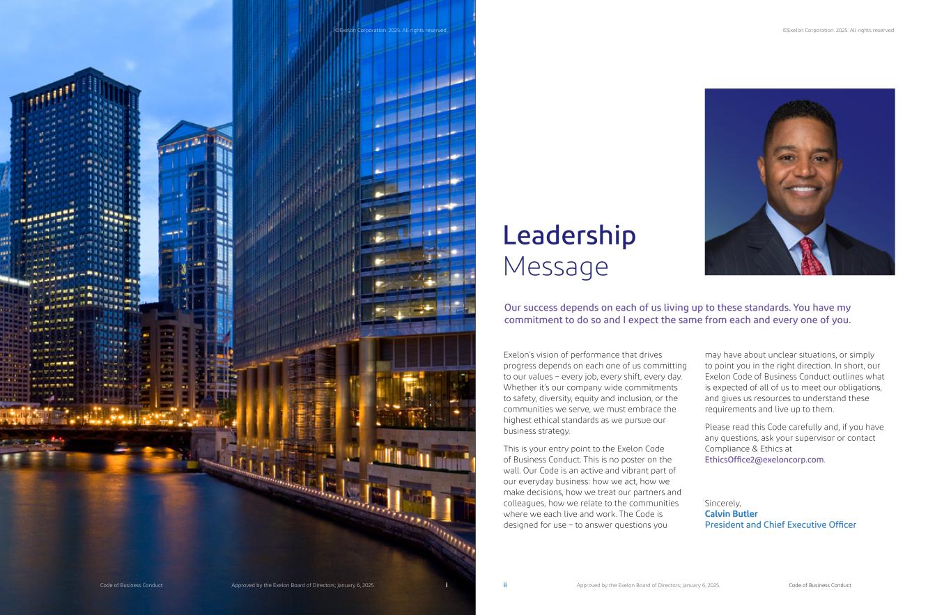 Exelon’s vision of performance that drives progress depends on each one of us committing to our values – every job, every shift, every day. Whether it’s our company wide commitments to safety, diversity, equity and inclusion, or the communities we serve, we must embrace the highest ethical standards as we pursue our business strategy. This is your entry point to the Exelon Code of Business Conduct. This is no poster on the wall. Our Code is an active and vibrant part of our everyday business: how we act, how we make decisions, how we treat our partners and colleagues, how we relate to the communities where we each live and work. The Code is designed for use – to answer questions you Our success depends on each of us living up to these standards. You have my commitment to do so and I expect the same from each and every one of you. Leadership Message may have about unclear situations, or simply to point you in the right direction. In short, our Exelon Code of Business Conduct outlines what is expected of all of us to meet our obligations, and gives us resources to understand these requirements and live up to them. Please read this Code carefully and, if you have any questions, ask your supervisor or contact Compliance & Ethics at EthicsOffice2@exeloncorp.com. Sincerely, Calvin Butler President and Chief Executive Officer ©Exelon Corporation. 2025. All rights reserved. ii Code of Business ConductApproved by the Exelon Board of Directors; January 6, 2025. ©Exelon Corporation. 2025. All rights reserved. iCode of Business Conduct Approved by the Exelon Board of Directors; January 6, 2025.