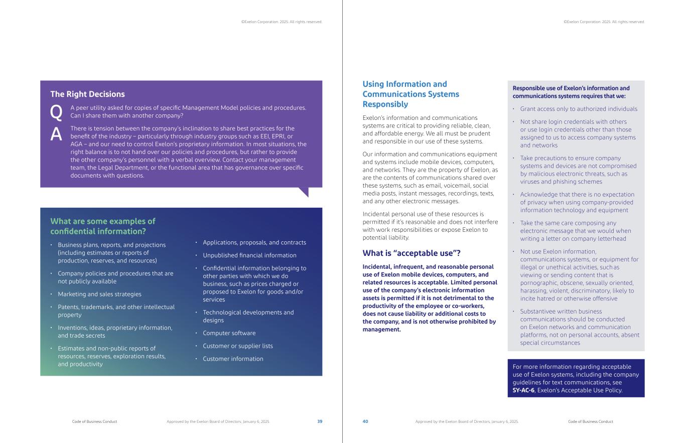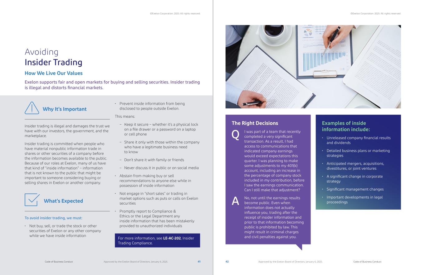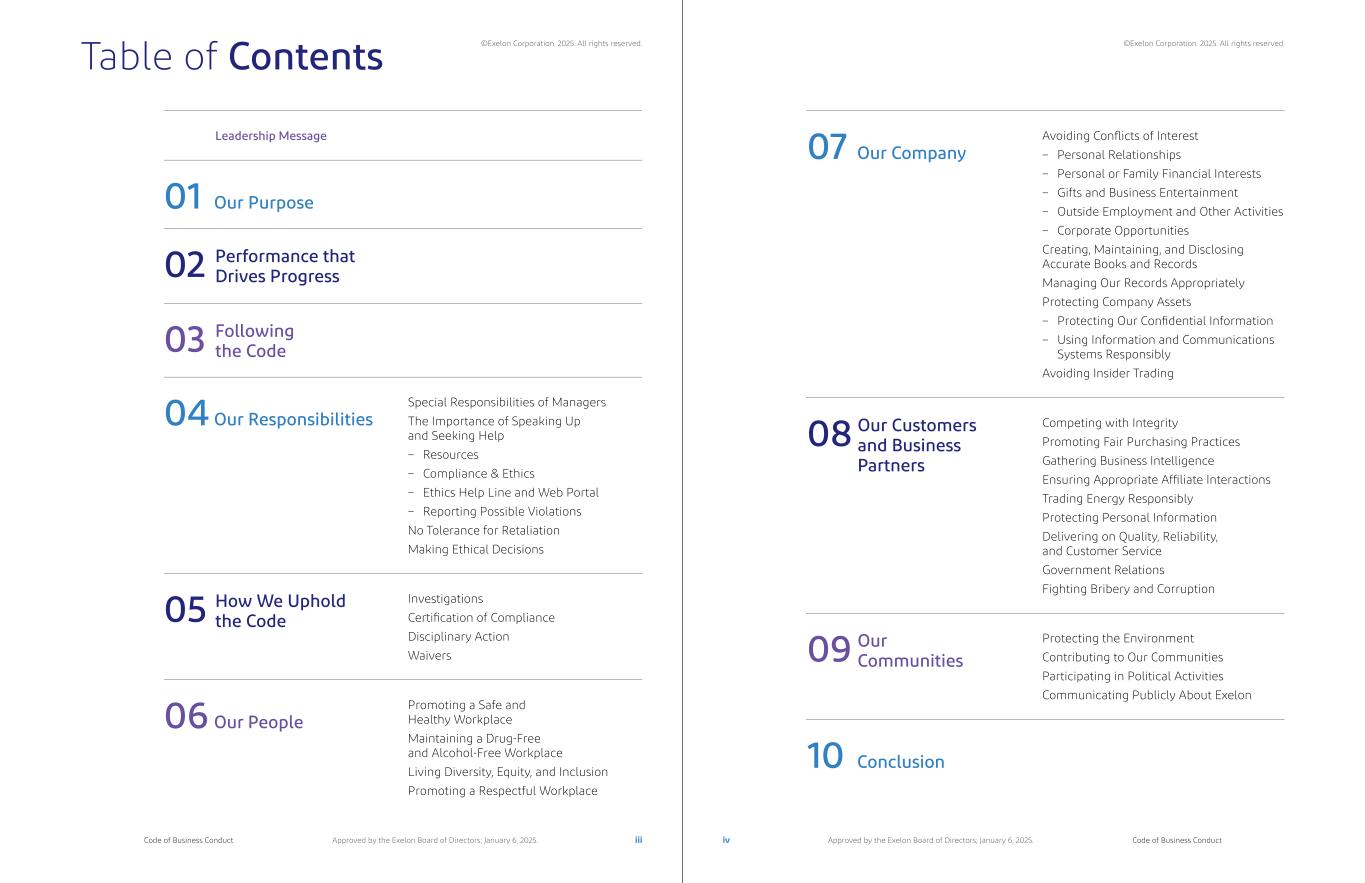 Table of Contents 04 Our Responsibilities 06 Our People 07 Our Company 10 Conclusion 05 08 09 03 Following the Code 02 Performance that Drives Progress 01 Our Purpose Special Responsibilities of Managers The Importance of Speaking Up and Seeking Help – Resources – Compliance & Ethics – Ethics Help Line and Web Portal – Reporting Possible Violations No Tolerance for Retaliation Making Ethical Decisions Investigations Certification of Compliance Disciplinary Action Waivers Promoting a Safe and Healthy Workplace Maintaining a Drug-Free and Alcohol-Free Workplace Living Diversity, Equity, and Inclusion Promoting a Respectful Workplace Avoiding Conflicts of Interest – Personal Relationships – Personal or Family Financial Interests – Gifts and Business Entertainment – Outside Employment and Other Activities – Corporate Opportunities Creating, Maintaining, and Disclosing Accurate Books and Records Managing Our Records Appropriately Protecting Company Assets – Protecting Our Confidential Information – Using Information and Communications Systems Responsibly Avoiding Insider Trading Competing with Integrity Promoting Fair Purchasing Practices Gathering Business Intelligence Ensuring Appropriate Affiliate Interactions Trading Energy Responsibly Protecting Personal Information Delivering on Quality, Reliability, and Customer Service Government Relations Fighting Bribery and Corruption Protecting the Environment Contributing to Our Communities Participating in Political Activities Communicating Publicly About Exelon How We Uphold the Code Our Customers and Business Partners Our Communities Leadership Message iii ivCode of Business Conduct Code of Business ConductApproved by the Exelon Board of Directors; January 6, 2025. Approved by the Exelon Board of Directors; January 6, 2025. ©Exelon Corporation. 2025. All rights reserved. ©Exelon Corporation. 2025. All rights reserved.