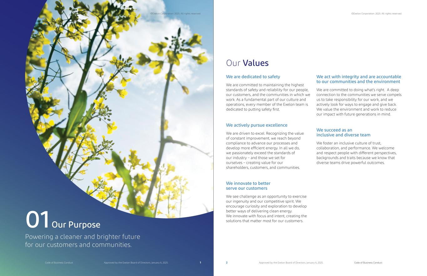 Powering a cleaner and brighter future for our customers and communities. Our Purpose01 Our Values We are dedicated to safety We are committed to maintaining the highest standards of safety and reliability for our people, our customers, and the communities in which we work. As a fundamental part of our culture and operations, every member of the Exelon team is dedicated to putting safety first. We actively pursue excellence We are driven to excel. Recognizing the value of constant improvement, we reach beyond compliance to advance our processes and develop more efficient energy. In all we do, we passionately exceed the standards of our industry – and those we set for ourselves – creating value for our shareholders, customers, and communities. We innovate to better serve our customers We see challenge as an opportunity to exercise our ingenuity and our competitive spirit. We encourage curiosity and exploration to develop better ways of delivering clean energy. We innovate with focus and intent, creating the solutions that matter most for our customers. We act with integrity and are accountable to our communities and the environment We are committed to doing what’s right. A deep connection to the communities we serve compels us to take responsibility for our work, and we actively look for ways to engage and give back. We value the environment and work to reduce our impact with future generations in mind. We succeed as an inclusive and diverse team We foster an inclusive culture of trust, collaboration, and performance. We welcome and respect people with different perspectives, backgrounds and traits because we know that diverse teams drive powerful outcomes. Our Values ©Exelon Corporation. 2025. All rights reserved. ©Exelon Corporation. 2025. All rights reserved. 1 2Code of Business Conduct Code of Business ConductApproved by the Exelon Board of Directors; January 6, 2025. Approved by the Exelon Board of Directors; January 6, 2025.