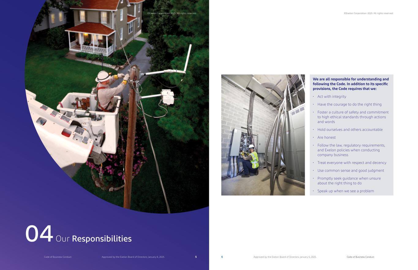 We are all responsible for understanding and following the Code. In addition to its specific provisions, the Code requires that we: • Act with integrity • Have the courage to do the right thing • Foster a culture of safety and commitment to high ethical standards through actions and words • Hold ourselves and others accountable • Are honest • Follow the law, regulatory requirements, and Exelon policies when conducting company business • Treat everyone with respect and decency • Use common sense and good judgment • Promptly seek guidance when unsure about the right thing to do • Speak up when we see a problem Our Responsibilities04 ©Exelon Corporation. 2025. All rights reserved. 6 Code of Business ConductApproved by the Exelon Board of Directors; January 6, 2025. ©Exelon Corporation. 2025. All rights reserved. 5Code of Business Conduct Approved by the Exelon Board of Directors; January 6, 2025.