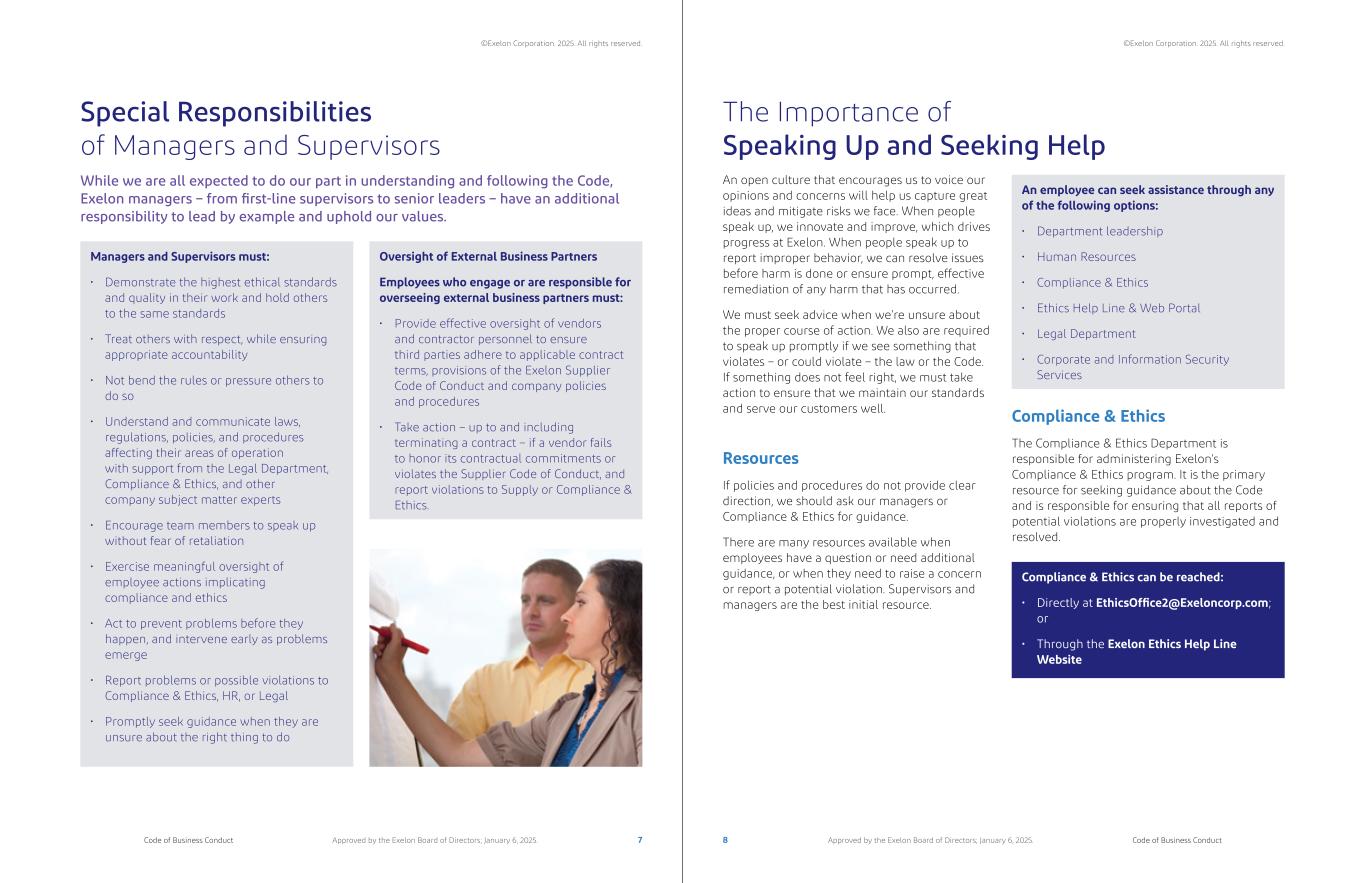 Special Responsibilities of Managers and Supervisors Managers and Supervisors must: • Demonstrate the highest ethical standards and quality in their work and hold others to the same standards • Treat others with respect, while ensuring appropriate accountability • Not bend the rules or pressure others to do so • Understand and communicate laws, regulations, policies, and procedures affecting their areas of operation with support from the Legal Department, Compliance & Ethics, and other company subject matter experts • Encourage team members to speak up without fear of retaliation • Exercise meaningful oversight of employee actions implicating compliance and ethics • Act to prevent problems before they happen, and intervene early as problems emerge • Report problems or possible violations to Compliance & Ethics, HR, or Legal • Promptly seek guidance when they are unsure about the right thing to do An employee can seek assistance through any of the following options: • Department leadership • Human Resources • Compliance & Ethics • Ethics Help Line & Web Portal • Legal Department • Corporate and Information Security Services Compliance & Ethics can be reached: • Directly at EthicsOffice2@Exeloncorp.com; or • Through the Exelon Ethics Help Line Website While we are all expected to do our part in understanding and following the Code, Exelon managers – from first-line supervisors to senior leaders – have an additional responsibility to lead by example and uphold our values. Oversight of External Business Partners Employees who engage or are responsible for overseeing external business partners must: • Provide effective oversight of vendors and contractor personnel to ensure third parties adhere to applicable contract terms, provisions of the Exelon Supplier Code of Conduct and company policies and procedures • Take action – up to and including terminating a contract – if a vendor fails to honor its contractual commitments or violates the Supplier Code of Conduct, and report violations to Supply or Compliance & Ethics. An open culture that encourages us to voice our opinions and concerns will help us capture great ideas and mitigate risks we face. When people speak up, we innovate and improve, which drives progress at Exelon. When people speak up to report improper behavior, we can resolve issues before harm is done or ensure prompt, effective remediation of any harm that has occurred. We must seek advice when we’re unsure about the proper course of action. We also are required to speak up promptly if we see something that violates – or could violate – the law or the Code. If something does not feel right, we must take action to ensure that we maintain our standards and serve our customers well. Resources If policies and procedures do not provide clear direction, we should ask our managers or Compliance & Ethics for guidance. There are many resources available when employees have a question or need additional guidance, or when they need to raise a concern or report a potential violation. Supervisors and managers are the best initial resource. Compliance & Ethics The Compliance & Ethics Department is responsible for administering Exelon’s Compliance & Ethics program. It is the primary resource for seeking guidance about the Code and is responsible for ensuring that all reports of potential violations are properly investigated and resolved. The Importance of Speaking Up and Seeking Help 7 8Code of Business Conduct Code of Business ConductApproved by the Exelon Board of Directors; January 6, 2025. Approved by the Exelon Board of Directors; January 6, 2025. ©Exelon Corporation. 2025. All rights reserved. ©Exelon Corporation. 2025. All rights reserved.