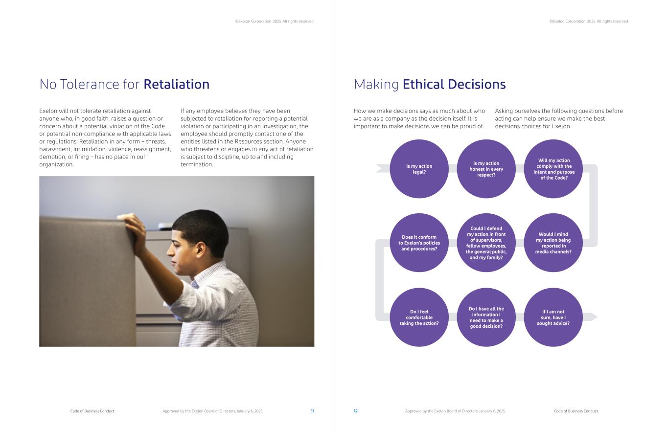 How we make decisions says as much about who we are as a company as the decision itself. It is important to make decisions we can be proud of. Making Ethical Decisions Could I defend my action in front of supervisors, fellow employees, the general public, and my family? Does it conform to Exelon’s policies and procedures? Would I mind my action being reported in media channels? Is my action legal? Is my action honest in every respect? Will my action comply with the intent and purpose of the Code? Do I feel comfortable taking the action? Do I have all the information I need to make a good decision? If I am not sure, have I sought advice? Exelon will not tolerate retaliation against anyone who, in good faith, raises a question or concern about a potential violation of the Code or potential non-compliance with applicable laws or regulations. Retaliation in any form – threats, harassment, intimidation, violence, reassignment, demotion, or firing – has no place in our organization. No Tolerance for Retaliation If any employee believes they have been subjected to retaliation for reporting a potential violation or participating in an investigation, the employee should promptly contact one of the entities listed in the Resources section. Anyone who threatens or engages in any act of retaliation is subject to discipline, up to and including termination. Asking ourselves the following questions before acting can help ensure we make the best decisions choices for Exelon. 11 12Code of Business Conduct Code of Business ConductApproved by the Exelon Board of Directors; January 6, 2025. Approved by the Exelon Board of Directors; January 6, 2025. ©Exelon Corporation. 2025. All rights reserved. ©Exelon Corporation. 2025. All rights reserved.