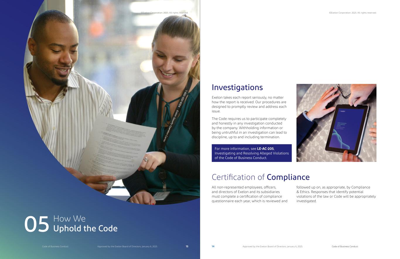 How We Uphold the Code05 Exelon takes each report seriously, no matter how the report is received. Our procedures are designed to promptly review and address each issue. The Code requires us to participate completely and honestly in any investigation conducted by the company. Withholding information or being untruthful in an investigation can lead to discipline, up to and including termination. Investigations Certification of Compliance For more information, see LE-AC-205, Investigating and Resolving Alleged Violations of the Code of Business Conduct. All non-represented employees, officers, and directors of Exelon and its subsidiaries must complete a certification of compliance questionnaire each year, which is reviewed and followed up on, as appropriate, by Compliance & Ethics. Responses that identify potential violations of the law or Code will be appropriately investigated. ©Exelon Corporation. 2025. All rights reserved. ©Exelon Corporation. 2025. All rights reserved. 13 14Code of Business Conduct Code of Business ConductApproved by the Exelon Board of Directors; January 6, 2025. Approved by the Exelon Board of Directors; January 6, 2025.