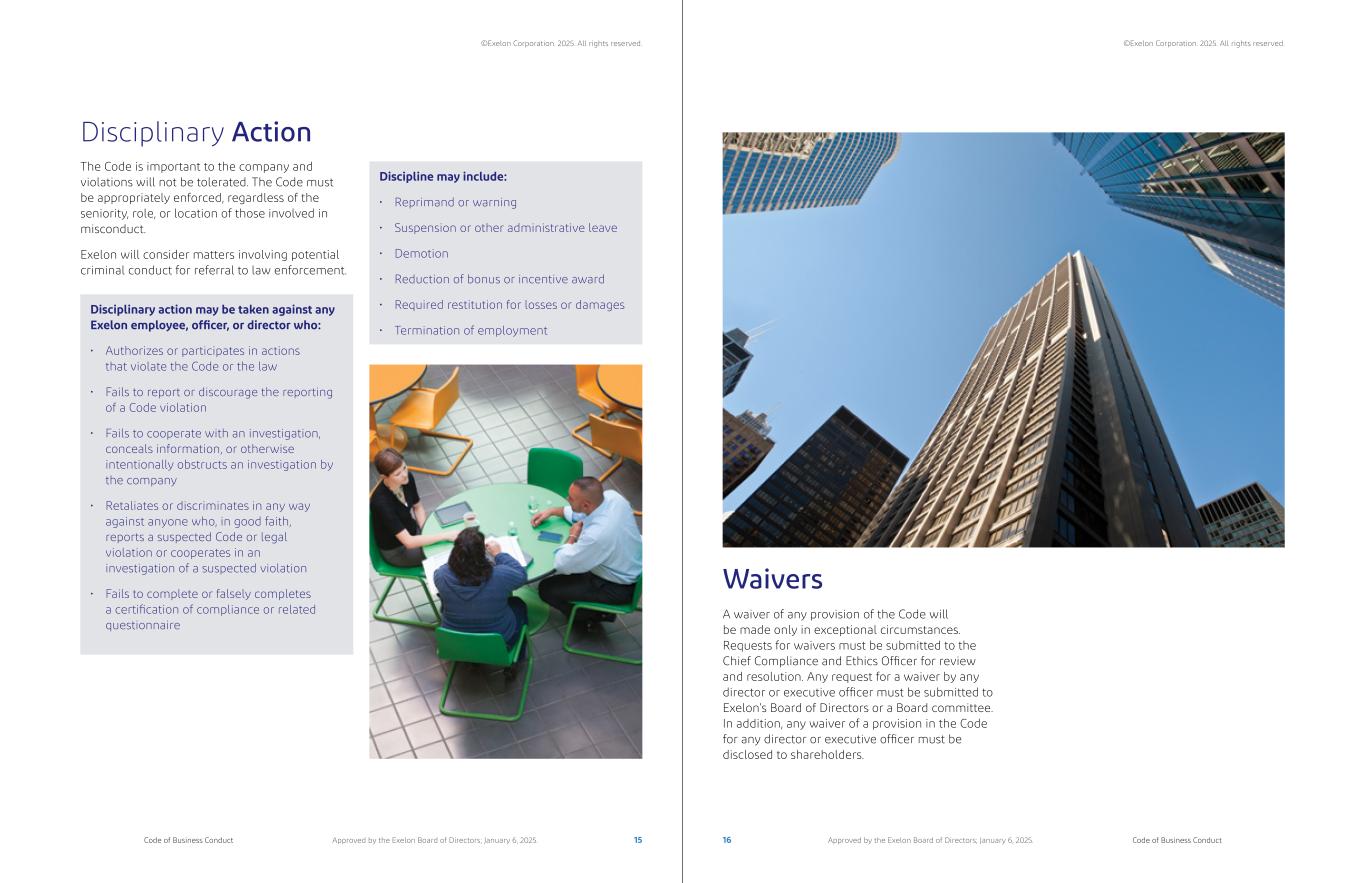 A waiver of any provision of the Code will be made only in exceptional circumstances. Requests for waivers must be submitted to the Chief Compliance and Ethics Officer for review and resolution. Any request for a waiver by any director or executive officer must be submitted to Exelon’s Board of Directors or a Board committee. In addition, any waiver of a provision in the Code for any director or executive officer must be disclosed to shareholders. Disciplinary Action The Code is important to the company and violations will not be tolerated. The Code must be appropriately enforced, regardless of the seniority, role, or location of those involved in misconduct. Exelon will consider matters involving potential criminal conduct for referral to law enforcement. Disciplinary action may be taken against any Exelon employee, officer, or director who: • Authorizes or participates in actions that violate the Code or the law • Fails to report or discourage the reporting of a Code violation • Fails to cooperate with an investigation, conceals information, or otherwise intentionally obstructs an investigation by the company • Retaliates or discriminates in any way against anyone who, in good faith, reports a suspected Code or legal violation or cooperates in an investigation of a suspected violation • Fails to complete or falsely completes a certification of compliance or related questionnaire Discipline may include: • Reprimand or warning • Suspension or other administrative leave • Demotion • Reduction of bonus or incentive award • Required restitution for losses or damages • Termination of employment Waivers 15 16Code of Business Conduct Code of Business ConductApproved by the Exelon Board of Directors; January 6, 2025. Approved by the Exelon Board of Directors; January 6, 2025. ©Exelon Corporation. 2025. All rights reserved. ©Exelon Corporation. 2025. All rights reserved.