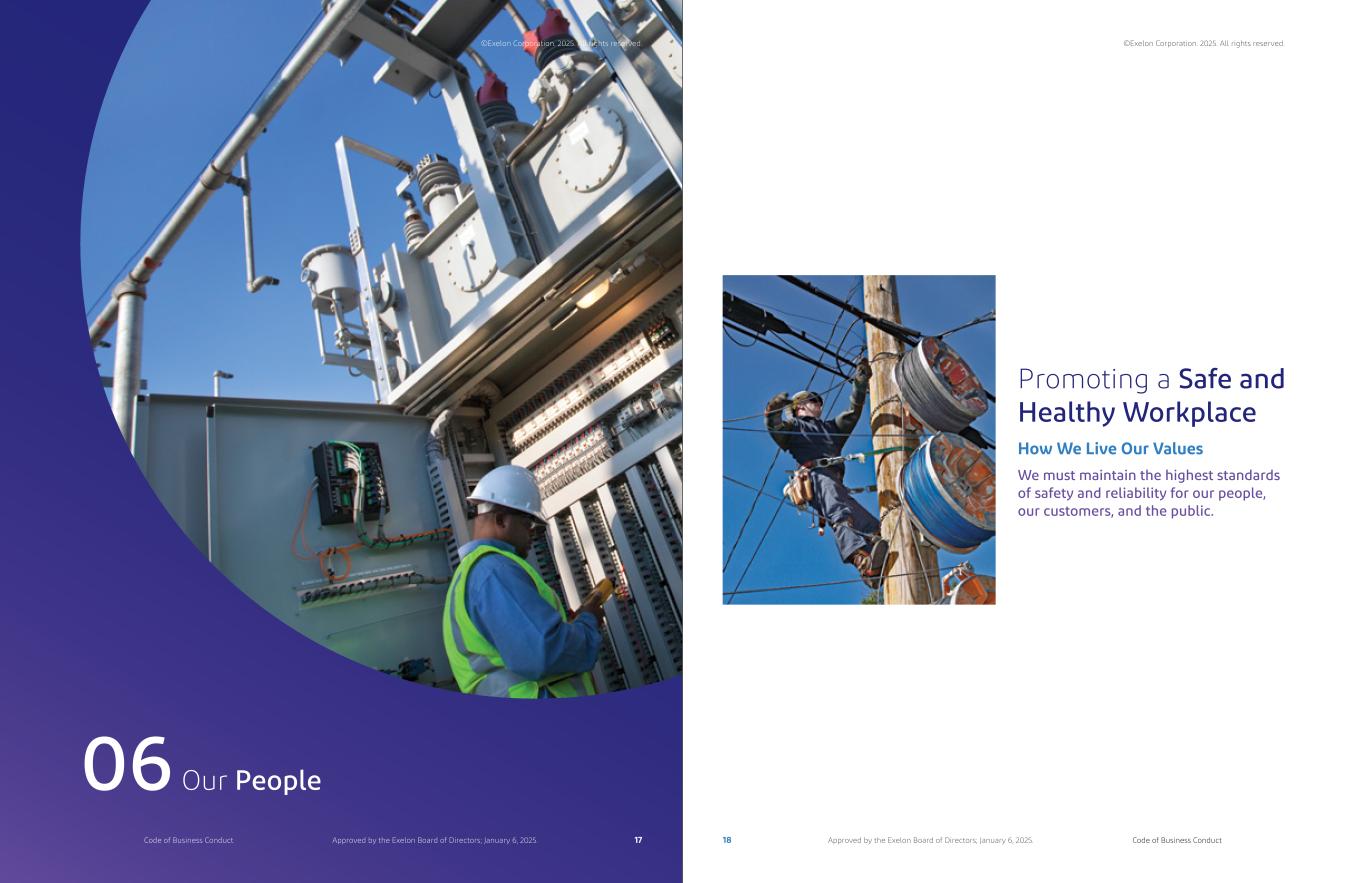 Our People06 Promoting a Safe and Healthy Workplace We must maintain the highest standards of safety and reliability for our people, our customers, and the public. How We Live Our Values ©Exelon Corporation. 2025. All rights reserved. 18 Code of Business ConductApproved by the Exelon Board of Directors; January 6, 2025. ©Exelon Corporation. 2025. All rights reserved. 17Code of Business Conduct Approved by the Exelon Board of Directors; January 6, 2025.