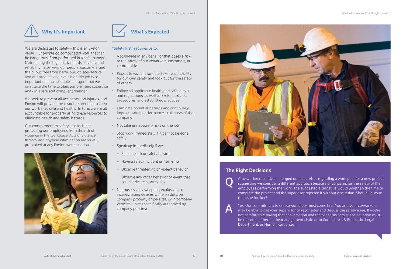 “Safety first” requires us to: • Not engage in any behavior that poses a risk to the safety of our coworkers, customers, or communities • Report to work fit for duty, take responsibility for our own safety and look out for the safety of others • Follow all applicable health and safety laws and regulations, as well as Exelon policies, procedures, and established practices • Eliminate potential hazards and continually improve safety performance in all areas of the company • Not take unnecessary risks on the job • Stop work immediately if it cannot be done safely • Speak up immediately if we: – See a health or safety hazard – Have a safety incident or near-miss – Observe threatening or violent behavior – Observe any other behavior or event that could indicate a safety risk • Not possess any weapons, explosives, or incapacitating devices while on duty, on company property or job sites, or in company vehicles (unless specifically authorized by company policies) What’s Expected We are dedicated to safety – this is an Exelon value. Our people do complicated work that can be dangerous if not performed in a safe manner. Maintaining the highest standards of safety and reliability helps keep our people, customers, and the public free from harm, our job sites secure, and our productivity levels high. No job is so important and no schedule so urgent that we can’t take the time to plan, perform, and supervise work in a safe and compliant manner. We seek to prevent all accidents and injuries, and Exelon will provide the resources needed to keep our work sites safe and healthy. In turn, we are all accountable for properly using these resources to eliminate health and safety hazards. Our commitment to safety also includes protecting our employees from the risk of violence in the workplace. Acts of violence, threats, and physical intimidation are strictly prohibited at any Exelon work location. Why It’s Important The Right Decisions A co-worker recently challenged our supervisor regarding a work plan for a new project, suggesting we consider a different approach because of concerns for the safety of the employees performing the work. The suggested alternative would lengthen the time to complete the project and the supervisor rejected it without discussion. Should I pursue the issue further? Yes. Our commitment to employee safety must come first. You and your co-workers may be able to get your supervisor to reconsider and discuss the safety issue. If you’re not comfortable having that conversation and the concerns persist, the situation must be reported either up the management chain or to Compliance & Ethics, the Legal Department, or Human Resources. A Q 19 20Code of Business Conduct Code of Business ConductApproved by the Exelon Board of Directors; January 6, 2025. Approved by the Exelon Board of Directors; January 6, 2025. ©Exelon Corporation. 2025. All rights reserved. ©Exelon Corporation. 2025. All rights reserved.