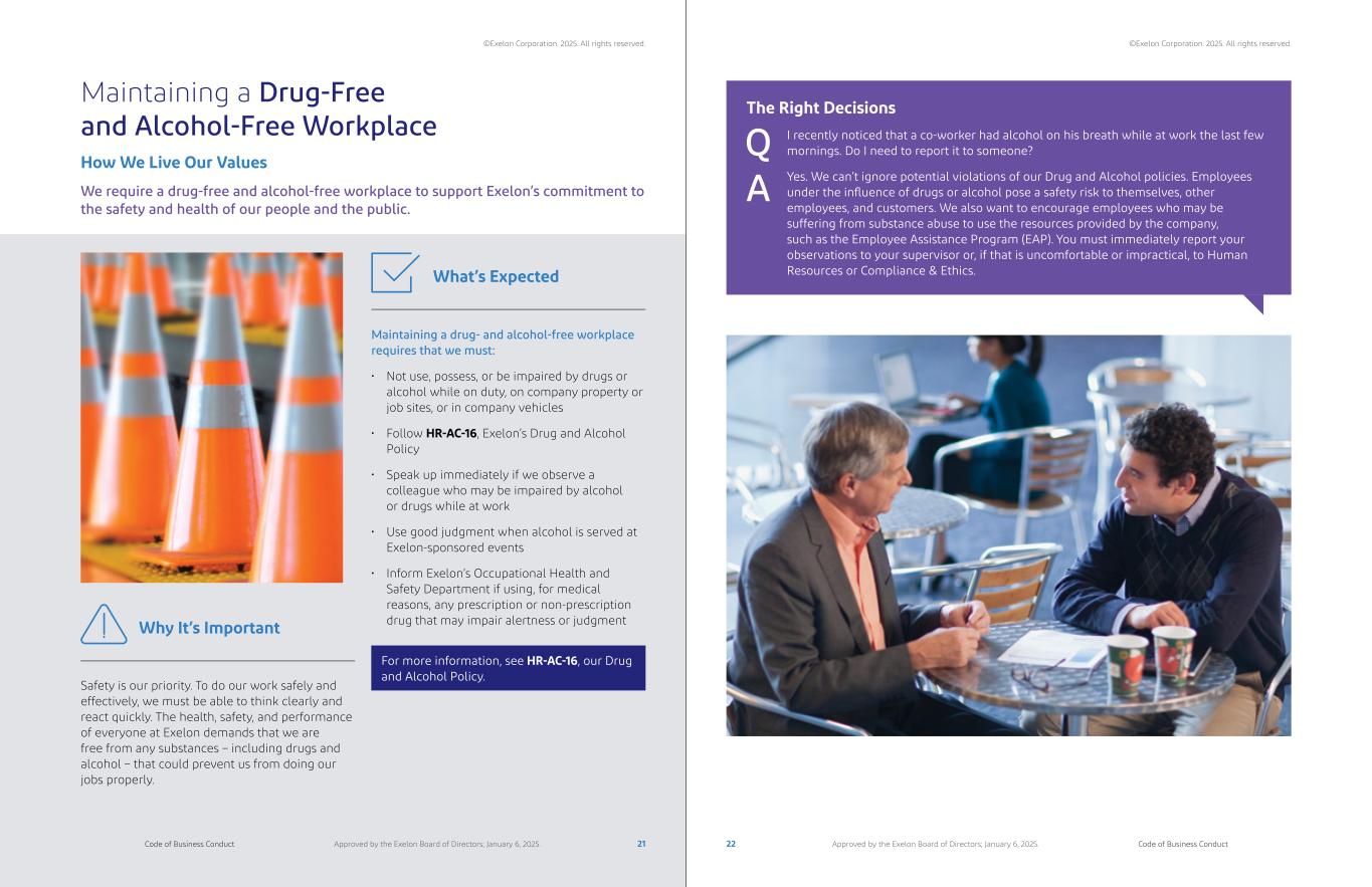 Maintaining a Drug-Free and Alcohol-Free Workplace How We Live Our Values We require a drug-free and alcohol-free workplace to support Exelon’s commitment to the safety and health of our people and the public. Safety is our priority. To do our work safely and effectively, we must be able to think clearly and react quickly. The health, safety, and performance of everyone at Exelon demands that we are free from any substances – including drugs and alcohol – that could prevent us from doing our jobs properly. Maintaining a drug- and alcohol-free workplace requires that we must: • Not use, possess, or be impaired by drugs or alcohol while on duty, on company property or job sites, or in company vehicles • Follow HR-AC-16, Exelon’s Drug and Alcohol Policy • Speak up immediately if we observe a colleague who may be impaired by alcohol or drugs while at work • Use good judgment when alcohol is served at Exelon-sponsored events • Inform Exelon’s Occupational Health and Safety Department if using, for medical reasons, any prescription or non-prescription drug that may impair alertness or judgmentWhy It’s Important What’s Expected For more information, see HR-AC-16, our Drug and Alcohol Policy. The Right Decisions I recently noticed that a co-worker had alcohol on his breath while at work the last few mornings. Do I need to report it to someone? Yes. We can’t ignore potential violations of our Drug and Alcohol policies. Employees under the influence of drugs or alcohol pose a safety risk to themselves, other employees, and customers. We also want to encourage employees who may be suffering from substance abuse to use the resources provided by the company, such as the Employee Assistance Program (EAP). You must immediately report your observations to your supervisor or, if that is uncomfortable or impractical, to Human Resources or Compliance & Ethics. A Q 21 22Code of Business Conduct Code of Business ConductApproved by the Exelon Board of Directors; January 6, 2025. Approved by the Exelon Board of Directors; January 6, 2025. ©Exelon Corporation. 2025. All rights reserved. ©Exelon Corporation. 2025. All rights reserved.