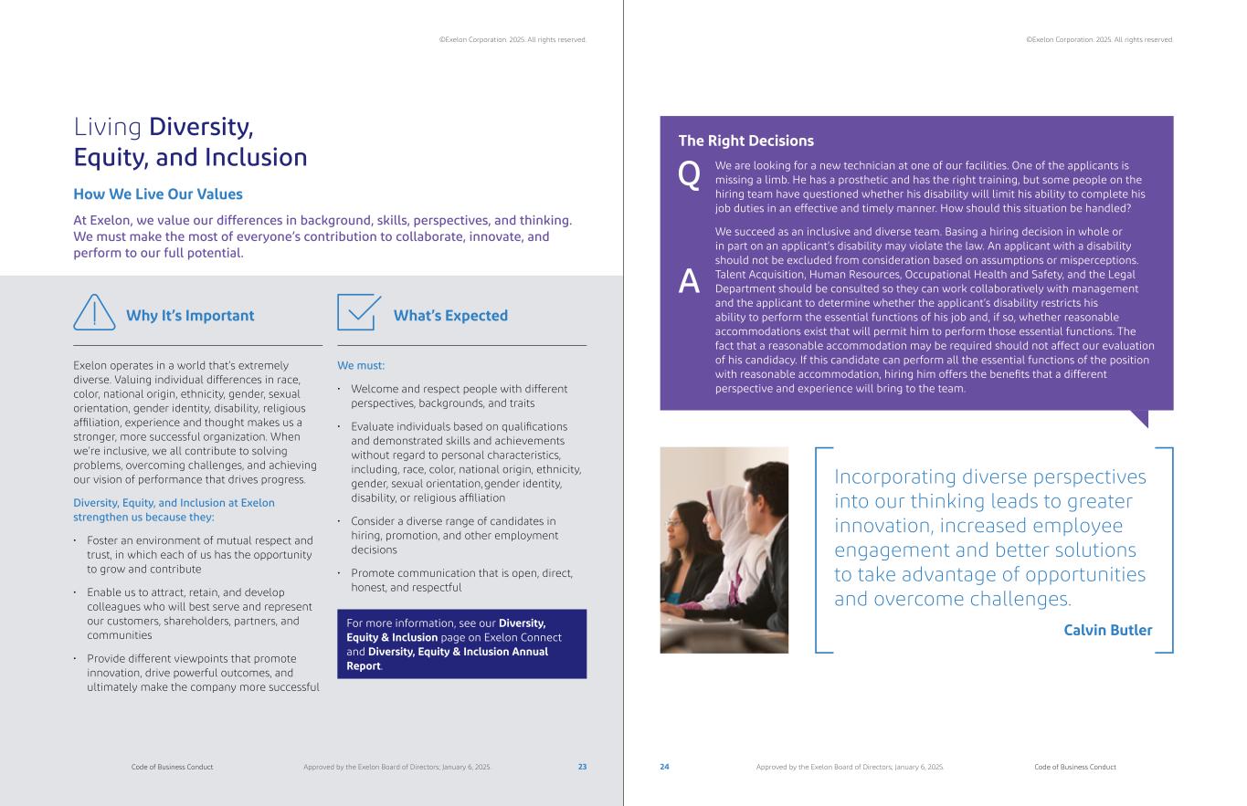 The Right Decisions We are looking for a new technician at one of our facilities. One of the applicants is missing a limb. He has a prosthetic and has the right training, but some people on the hiring team have questioned whether his disability will limit his ability to complete his job duties in an effective and timely manner. How should this situation be handled? We succeed as an inclusive and diverse team. Basing a hiring decision in whole or in part on an applicant’s disability may violate the law. An applicant with a disability should not be excluded from consideration based on assumptions or misperceptions. Talent Acquisition, Human Resources, Occupational Health and Safety, and the Legal Department should be consulted so they can work collaboratively with management and the applicant to determine whether the applicant’s disability restricts his ability to perform the essential functions of his job and, if so, whether reasonable accommodations exist that will permit him to perform those essential functions. The fact that a reasonable accommodation may be required should not affect our evaluation of his candidacy. If this candidate can perform all the essential functions of the position with reasonable accommodation, hiring him offers the benefits that a different perspective and experience will bring to the team. Living Diversity, Equity, and Inclusion How We Live Our Values At Exelon, we value our differences in background, skills, perspectives, and thinking. We must make the most of everyone’s contribution to collaborate, innovate, and perform to our full potential. Exelon operates in a world that’s extremely diverse. Valuing individual differences in race, color, national origin, ethnicity, gender, sexual orientation, gender identity, disability, religious affiliation, experience and thought makes us a stronger, more successful organization. When we’re inclusive, we all contribute to solving problems, overcoming challenges, and achieving our vision of performance that drives progress. Diversity, Equity, and Inclusion at Exelon strengthen us because they: • Foster an environment of mutual respect and trust, in which each of us has the opportunity to grow and contribute • Enable us to attract, retain, and develop colleagues who will best serve and represent our customers, shareholders, partners, and communities • Provide different viewpoints that promote innovation, drive powerful outcomes, and ultimately make the company more successful We must: • Welcome and respect people with different perspectives, backgrounds, and traits • Evaluate individuals based on qualifications and demonstrated skills and achievements without regard to personal characteristics, including, race, color, national origin, ethnicity, gender, sexual orientation, gender identity, disability, or religious affiliation • Consider a diverse range of candidates in hiring, promotion, and other employment decisions • Promote communication that is open, direct, honest, and respectful For more information, see our Diversity, Equity & Inclusion page on Exelon Connect and Diversity, Equity & Inclusion Annual Report. Why It’s Important What’s Expected A Q Calvin Butler Incorporating diverse perspectives into our thinking leads to greater innovation, increased employee engagement and better solutions to take advantage of opportunities and overcome challenges. 23 24Code of Business Conduct Code of Business ConductApproved by the Exelon Board of Directors; January 6, 2025. Approved by the Exelon Board of Directors; January 6, 2025. ©Exelon Corporation. 2025. All rights reserved. ©Exelon Corporation. 2025. All rights reserved.