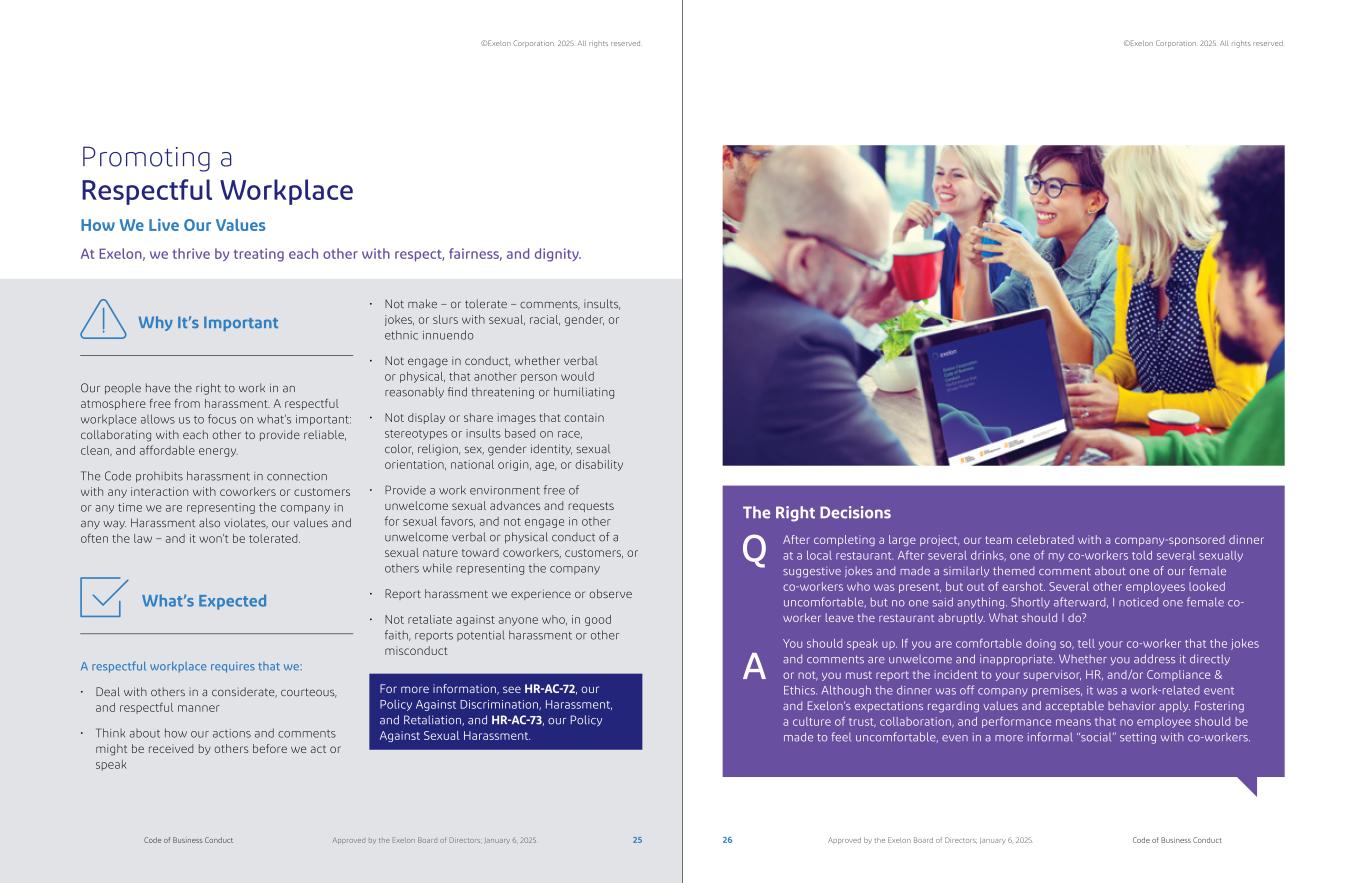 Promoting a Respectful Workplace How We Live Our Values At Exelon, we thrive by treating each other with respect, fairness, and dignity. Our people have the right to work in an atmosphere free from harassment. A respectful workplace allows us to focus on what’s important: collaborating with each other to provide reliable, clean, and affordable energy. The Code prohibits harassment in connection with any interaction with coworkers or customers or any time we are representing the company in any way. Harassment also violates, our values and often the law – and it won’t be tolerated. A respectful workplace requires that we: • Deal with others in a considerate, courteous, and respectful manner • Think about how our actions and comments might be received by others before we act or speak For more information, see HR-AC-72, our Policy Against Discrimination, Harassment, and Retaliation, and HR-AC-73, our Policy Against Sexual Harassment. Why It’s Important What’s Expected • Not make – or tolerate – comments, insults, jokes, or slurs with sexual, racial, gender, or ethnic innuendo • Not engage in conduct, whether verbal or physical, that another person would reasonably find threatening or humiliating • Not display or share images that contain stereotypes or insults based on race, color, religion, sex, gender identity, sexual orientation, national origin, age, or disability • Provide a work environment free of unwelcome sexual advances and requests for sexual favors, and not engage in other unwelcome verbal or physical conduct of a sexual nature toward coworkers, customers, or others while representing the company • Report harassment we experience or observe • Not retaliate against anyone who, in good faith, reports potential harassment or other misconduct The Right Decisions After completing a large project, our team celebrated with a company-sponsored dinner at a local restaurant. After several drinks, one of my co-workers told several sexually suggestive jokes and made a similarly themed comment about one of our female co-workers who was present, but out of earshot. Several other employees looked uncomfortable, but no one said anything. Shortly afterward, I noticed one female co- worker leave the restaurant abruptly. What should I do? You should speak up. If you are comfortable doing so, tell your co-worker that the jokes and comments are unwelcome and inappropriate. Whether you address it directly or not, you must report the incident to your supervisor, HR, and/or Compliance & Ethics. Although the dinner was off company premises, it was a work-related event and Exelon’s expectations regarding values and acceptable behavior apply. Fostering a culture of trust, collaboration, and performance means that no employee should be made to feel uncomfortable, even in a more informal “social” setting with co-workers. A Q 25 26Code of Business Conduct Code of Business ConductApproved by the Exelon Board of Directors; January 6, 2025. Approved by the Exelon Board of Directors; January 6, 2025. ©Exelon Corporation. 2025. All rights reserved. ©Exelon Corporation. 2025. All rights reserved.