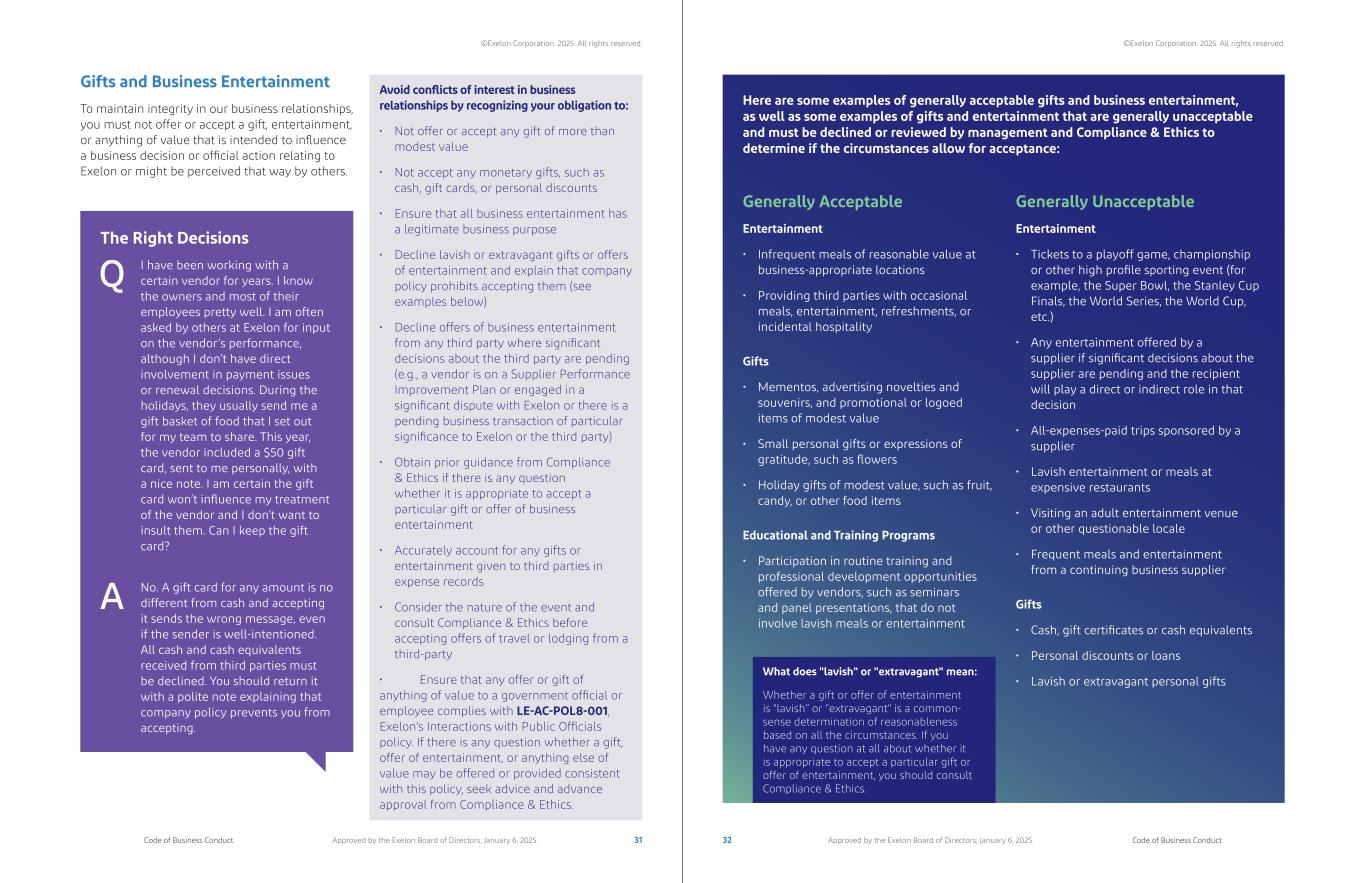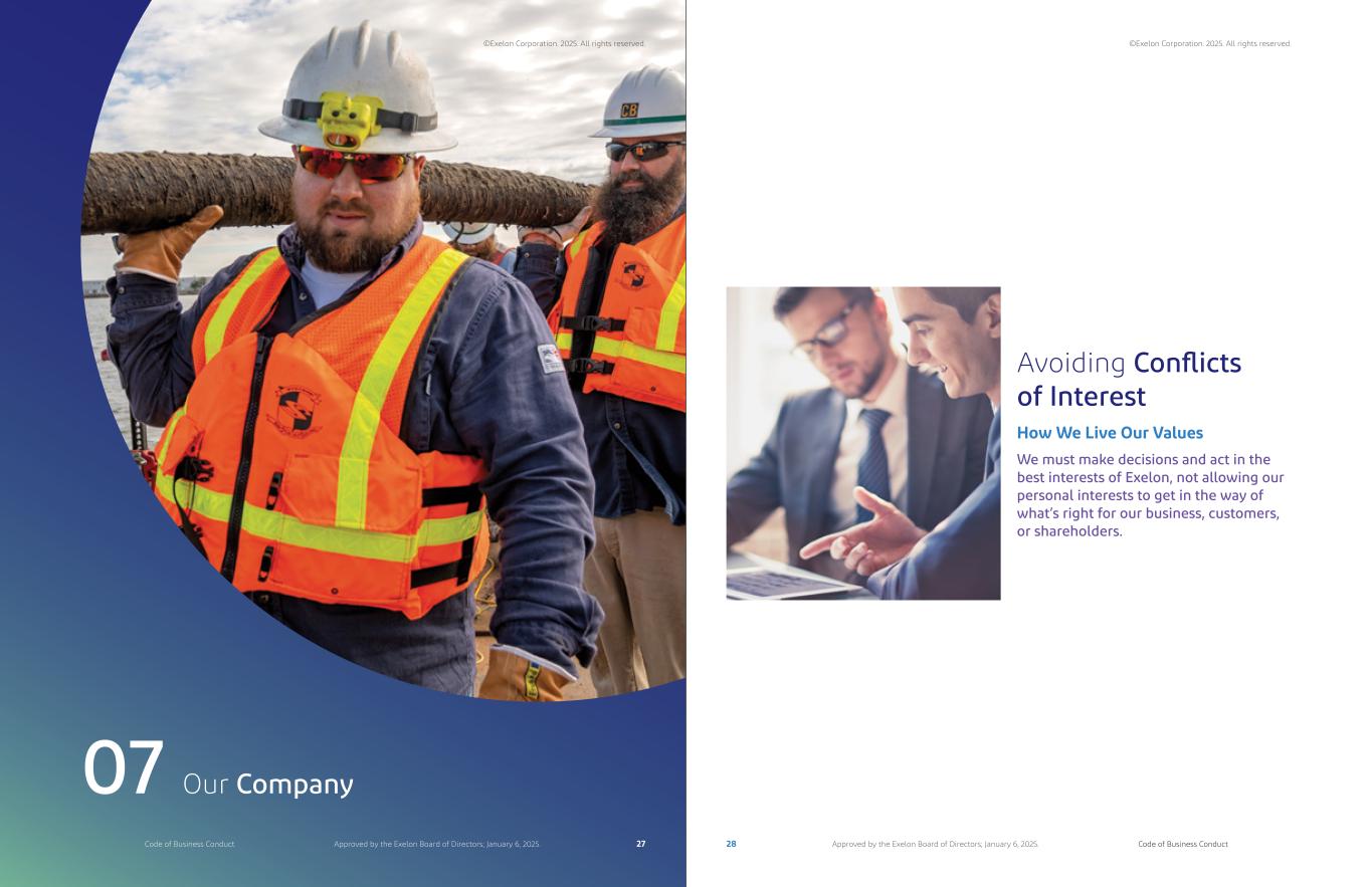 Our Company07 Avoiding Conflicts of Interest We must make decisions and act in the best interests of Exelon, not allowing our personal interests to get in the way of what’s right for our business, customers, or shareholders. How We Live Our Values ©Exelon Corporation. 2025. All rights reserved. ©Exelon Corporation. 2025. All rights reserved. 27 28Code of Business Conduct Code of Business ConductApproved by the Exelon Board of Directors; January 6, 2025. Approved by the Exelon Board of Directors; January 6, 2025.