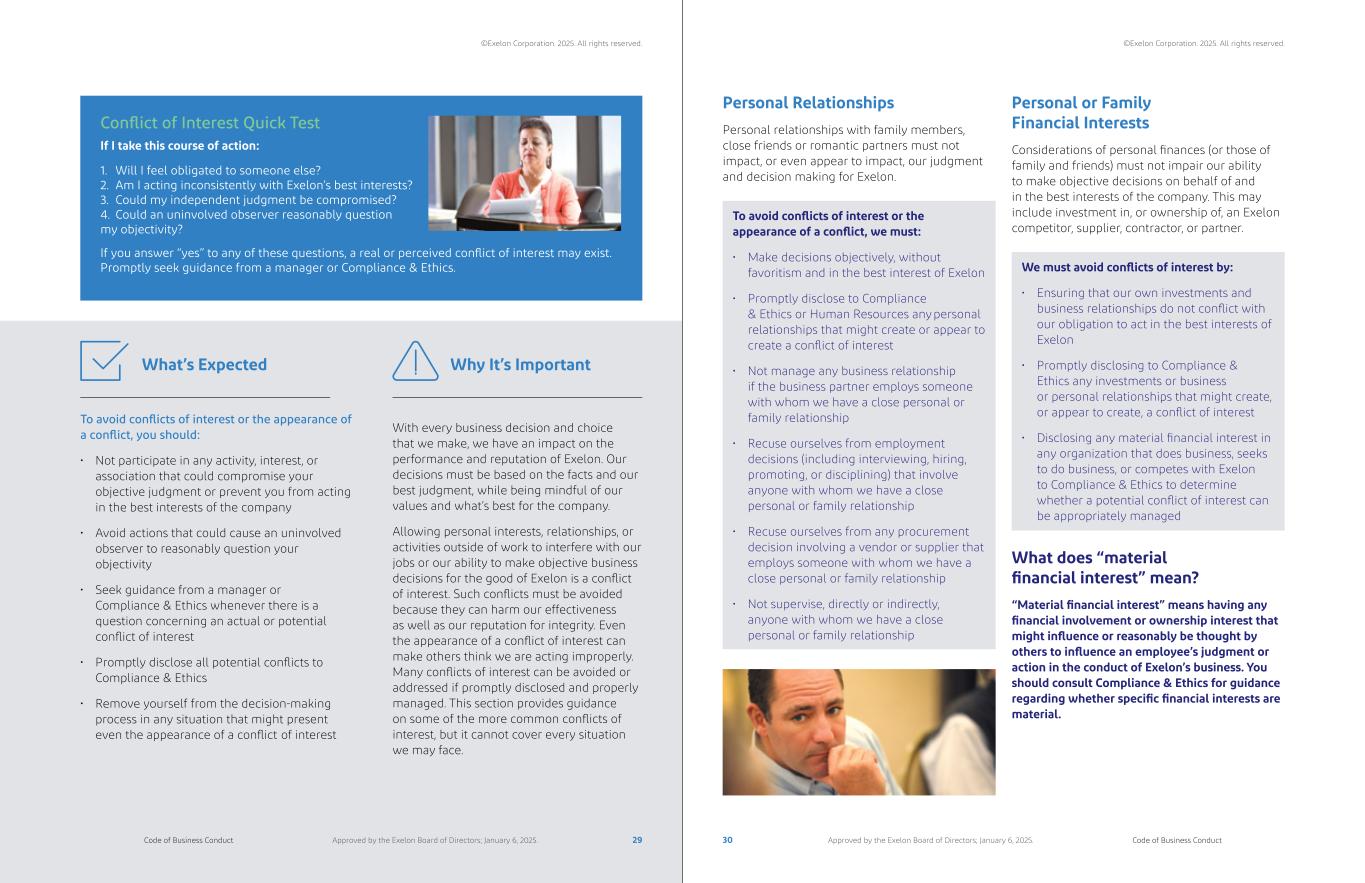 To avoid conflicts of interest or the appearance of a conflict, you should: • Not participate in any activity, interest, or association that could compromise your objective judgment or prevent you from acting in the best interests of the company • Avoid actions that could cause an uninvolved observer to reasonably question your objectivity • Seek guidance from a manager or Compliance & Ethics whenever there is a question concerning an actual or potential conflict of interest • Promptly disclose all potential conflicts to Compliance & Ethics • Remove yourself from the decision-making process in any situation that might present even the appearance of a conflict of interest To avoid conflicts of interest or the appearance of a conflict, we must: • Make decisions objectively, without favoritism and in the best interest of Exelon • Promptly disclose to Compliance & Ethics or Human Resources any personal relationships that might create or appear to create a conflict of interest • Not manage any business relationship if the business partner employs someone with whom we have a close personal or family relationship • Recuse ourselves from employment decisions (including interviewing, hiring, promoting, or disciplining) that involve anyone with whom we have a close personal or family relationship • Recuse ourselves from any procurement decision involving a vendor or supplier that employs someone with whom we have a close personal or family relationship • Not supervise, directly or indirectly, anyone with whom we have a close personal or family relationship We must avoid conflicts of interest by: • Ensuring that our own investments and business relationships do not conflict with our obligation to act in the best interests of Exelon • Promptly disclosing to Compliance & Ethics any investments or business or personal relationships that might create, or appear to create, a conflict of interest • Disclosing any material financial interest in any organization that does business, seeks to do business, or competes with Exelon to Compliance & Ethics to determine whether a potential conflict of interest can be appropriately managed What does “material financial interest” mean? “Material financial interest” means having any financial involvement or ownership interest that might influence or reasonably be thought by others to influence an employee’s judgment or action in the conduct of Exelon’s business. You should consult Compliance & Ethics for guidance regarding whether specific financial interests are material. What’s Expected Personal Relationships Personal relationships with family members, close friends or romantic partners must not impact, or even appear to impact, our judgment and decision making for Exelon. Personal or Family Financial Interests Considerations of personal finances (or those of family and friends) must not impair our ability to make objective decisions on behalf of and in the best interests of the company. This may include investment in, or ownership of, an Exelon competitor, supplier, contractor, or partner. Conflict of Interest Quick Test If I take this course of action: 1. Will I feel obligated to someone else? 2. Am I acting inconsistently with Exelon’s best interests? 3. Could my independent judgment be compromised? 4. Could an uninvolved observer reasonably question my objectivity? If you answer “yes” to any of these questions, a real or perceived conflict of interest may exist. Promptly seek guidance from a manager or Compliance & Ethics. With every business decision and choice that we make, we have an impact on the performance and reputation of Exelon. Our decisions must be based on the facts and our best judgment, while being mindful of our values and what’s best for the company. Allowing personal interests, relationships, or activities outside of work to interfere with our jobs or our ability to make objective business decisions for the good of Exelon is a conflict of interest. Such conflicts must be avoided because they can harm our effectiveness as well as our reputation for integrity. Even the appearance of a conflict of interest can make others think we are acting improperly. Many conflicts of interest can be avoided or addressed if promptly disclosed and properly managed. This section provides guidance on some of the more common conflicts of interest, but it cannot cover every situation we may face. Why It’s Important 29 30Code of Business Conduct Code of Business ConductApproved by the Exelon Board of Directors; January 6, 2025. Approved by the Exelon Board of Directors; January 6, 2025. ©Exelon Corporation. 2025. All rights reserved. ©Exelon Corporation. 2025. All rights reserved.
