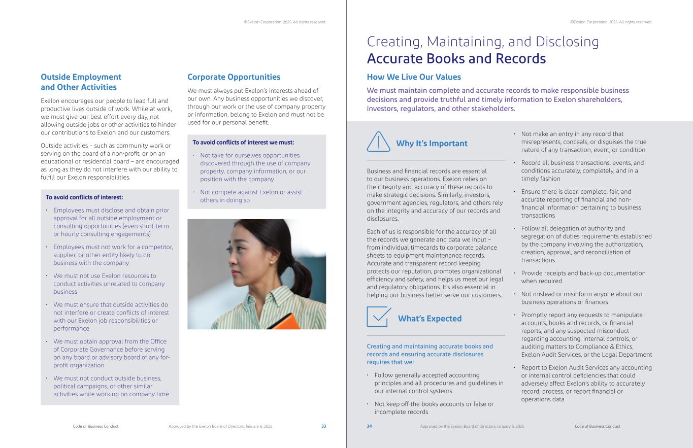 Outside Employment and Other Activities Exelon encourages our people to lead full and productive lives outside of work. While at work, we must give our best effort every day, not allowing outside jobs or other activities to hinder our contributions to Exelon and our customers. Outside activities – such as community work or serving on the board of a non-profit, or on an educational or residential board – are encouraged as long as they do not interfere with our ability to fulfill our Exelon responsibilities. Corporate Opportunities We must always put Exelon’s interests ahead of our own. Any business opportunities we discover, through our work or the use of company property or information, belong to Exelon and must not be used for our personal benefit. To avoid conflicts of interest: • Employees must disclose and obtain prior approval for all outside employment or consulting opportunities (even short-term or hourly consulting engagements) • Employees must not work for a competitor, supplier, or other entity likely to do business with the company • We must not use Exelon resources to conduct activities unrelated to company business • We must ensure that outside activities do not interfere or create conflicts of interest with our Exelon job responsibilities or performance • We must obtain approval from the Office of Corporate Governance before serving on any board or advisory board of any for- profit organization • We must not conduct outside business, political campaigns, or other similar activities while working on company time To avoid conflicts of interest we must: • Not take for ourselves opportunities discovered through the use of company property, company information, or our position with the company • Not compete against Exelon or assist others in doing so Creating, Maintaining, and Disclosing Accurate Books and Records We must maintain complete and accurate records to make responsible business decisions and provide truthful and timely information to Exelon shareholders, investors, regulators, and other stakeholders. How We Live Our Values Business and financial records are essential to our business operations. Exelon relies on the integrity and accuracy of these records to make strategic decisions. Similarly, investors, government agencies, regulators, and others rely on the integrity and accuracy of our records and disclosures. Each of us is responsible for the accuracy of all the records we generate and data we input – from individual timecards to corporate balance sheets to equipment maintenance records. Accurate and transparent record keeping protects our reputation, promotes organizational efficiency and safety, and helps us meet our legal and regulatory obligations. It’s also essential in helping our business better serve our customers. Creating and maintaining accurate books and records and ensuring accurate disclosures requires that we: • Follow generally accepted accounting principles and all procedures and guidelines in our internal control systems • Not keep off-the-books accounts or false or incomplete records Why It’s Important What’s Expected • Not make an entry in any record that misrepresents, conceals, or disguises the true nature of any transaction, event, or condition • Record all business transactions, events, and conditions accurately, completely, and in a timely fashion • Ensure there is clear, complete, fair, and accurate reporting of financial and non- financial information pertaining to business transactions • Follow all delegation of authority and segregation of duties requirements established by the company involving the authorization, creation, approval, and reconciliation of transactions • Provide receipts and back-up documentation when required • Not mislead or misinform anyone about our business operations or finances • Promptly report any requests to manipulate accounts, books and records, or financial reports, and any suspected misconduct regarding accounting, internal controls, or auditing matters to Compliance & Ethics, Exelon Audit Services, or the Legal Department • Report to Exelon Audit Services any accounting or internal control deficiencies that could adversely affect Exelon’s ability to accurately record, process, or report financial or operations data 33 34Code of Business Conduct Code of Business ConductApproved by the Exelon Board of Directors; January 6, 2025. Approved by the Exelon Board of Directors; January 6, 2025. ©Exelon Corporation. 2025. All rights reserved. ©Exelon Corporation. 2025. All rights reserved.